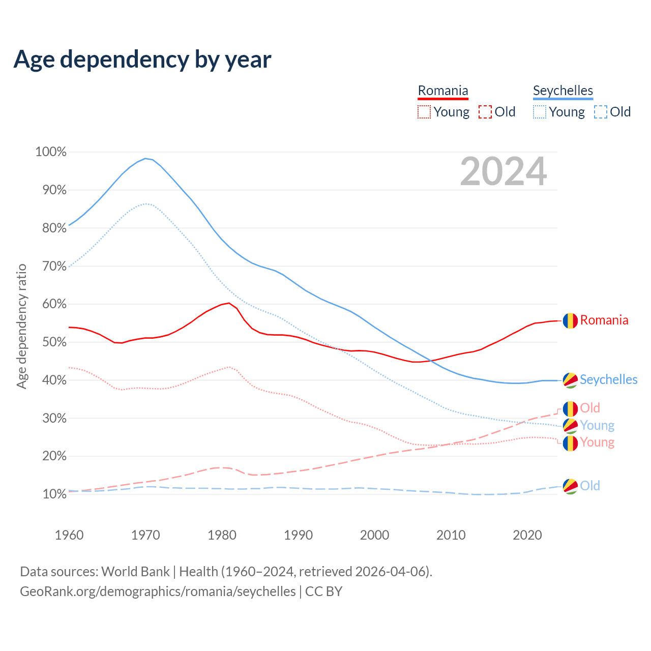 - The share of old-age demographic (65+) in Romania is 20% vs 8.54% in the Seychelles.