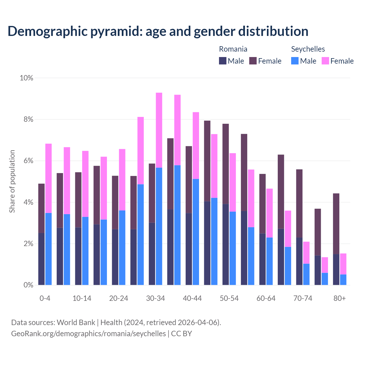 The share of older people aged 65 and over is 20% in Romania and 8.54% in the Seychelles. Life expectancy in Romania compared to the Seychelles .