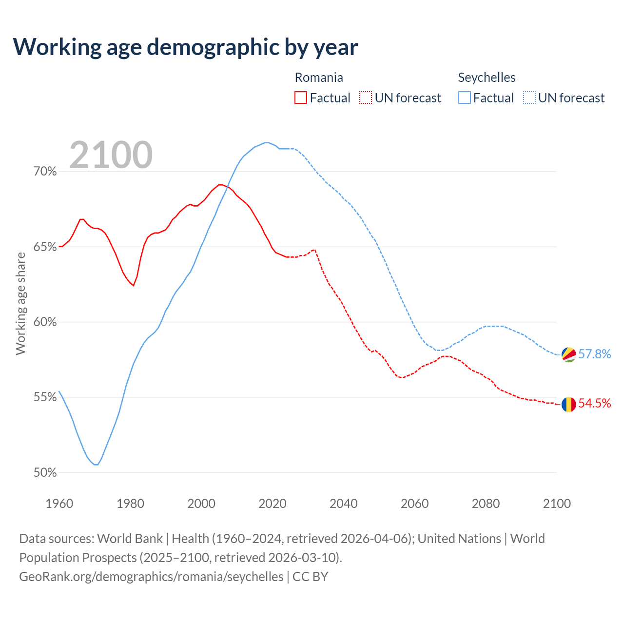 - Romania has 12.1M working age adults (aged 15-64) vs 90.3K in the Seychelles.