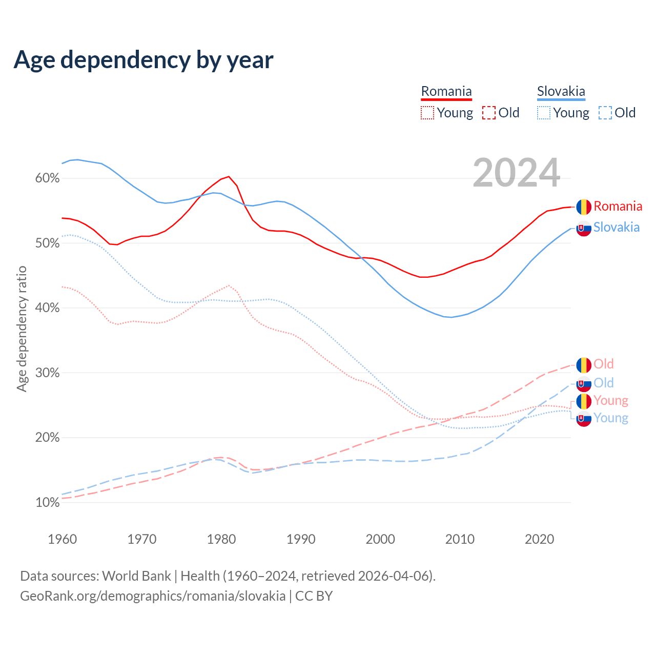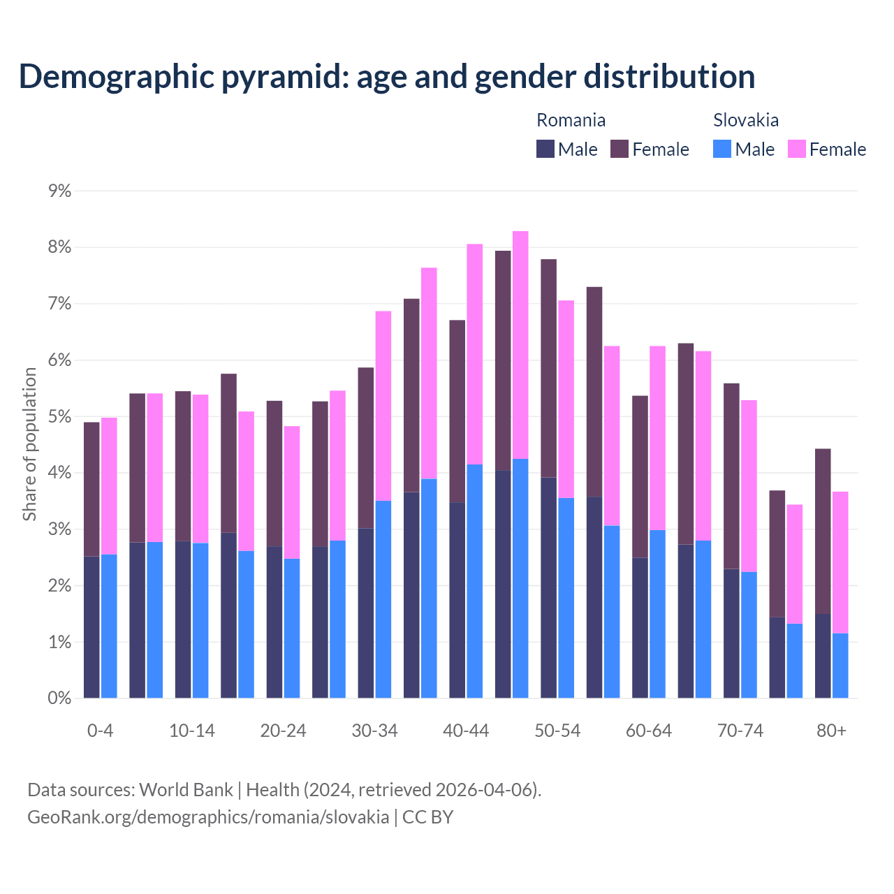 - Romania is ranked 23/196 by median age (oldest to youngest) vs 31/196 for Slovakia.