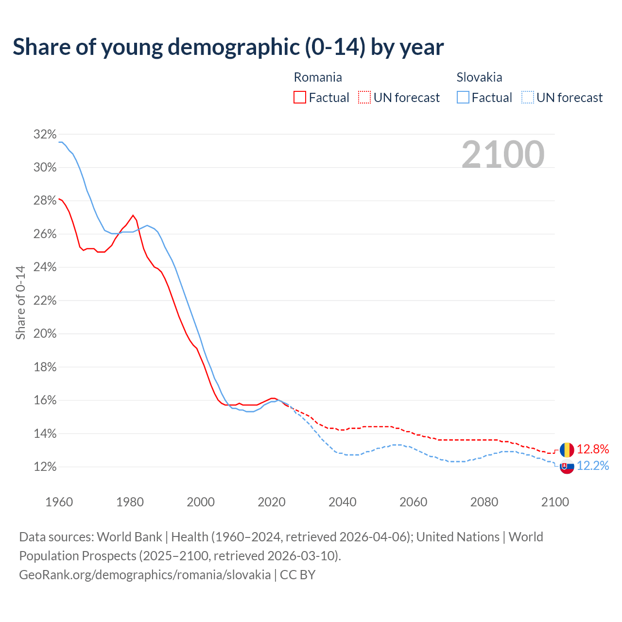 - The share of young demographic (0-15 years old) in Romania is 15.7% vs 15.8% in Slovakia.