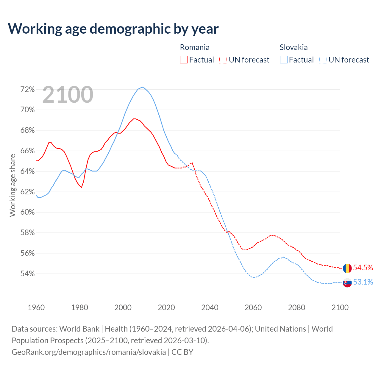 - Romania has 12.1M working age adults (aged 15-64) vs 3.52M in Slovakia.