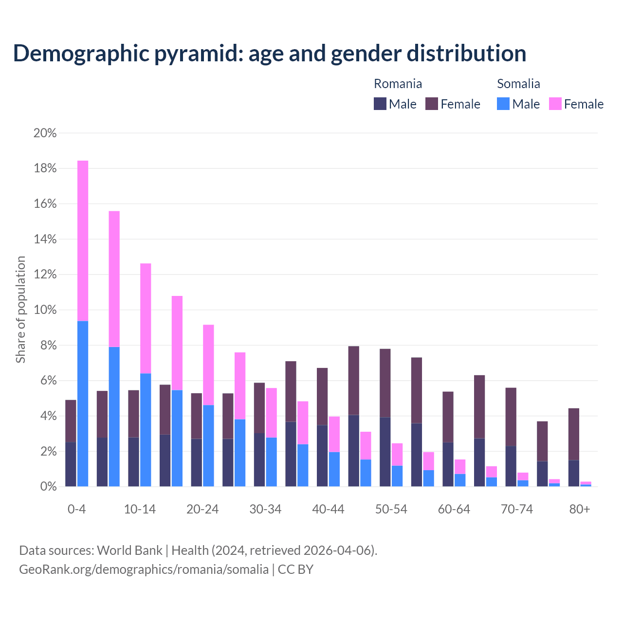 The share of older people aged 65 and over is 20% in Romania and 2.59% in Somalia. Life expectancy in Romania compared to Somalia .