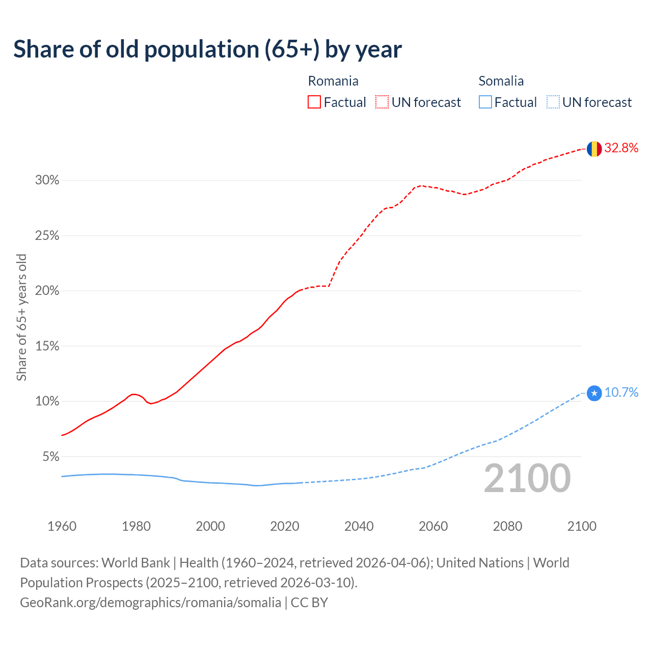- The share of old-age demographic (65+) in Romania is 20% vs 2.59% in Somalia.