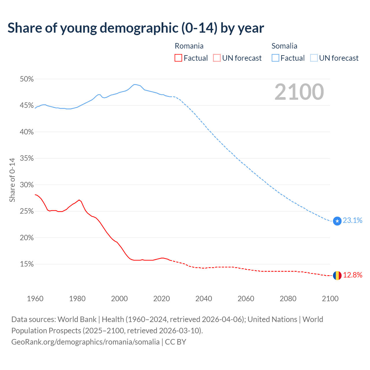 - The share of young demographic (0-15 years old) in Romania is 15.7% vs 46.6% in Somalia.