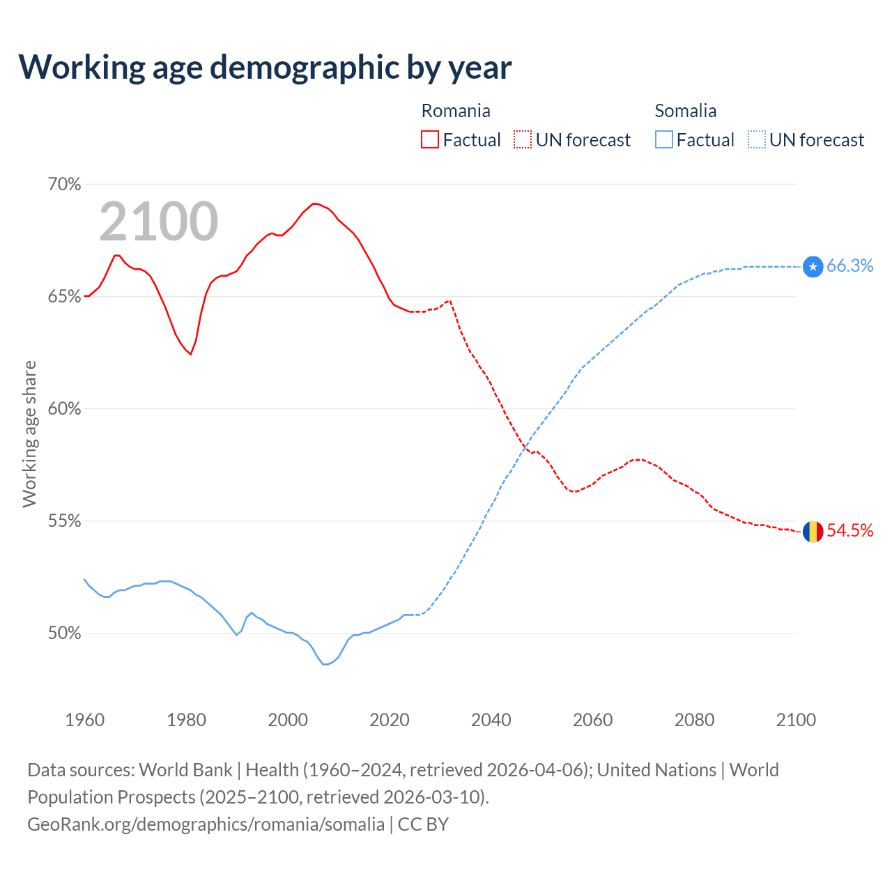 - Romania has 12.1M working age adults (aged 15-64) vs 10.4M in Somalia.