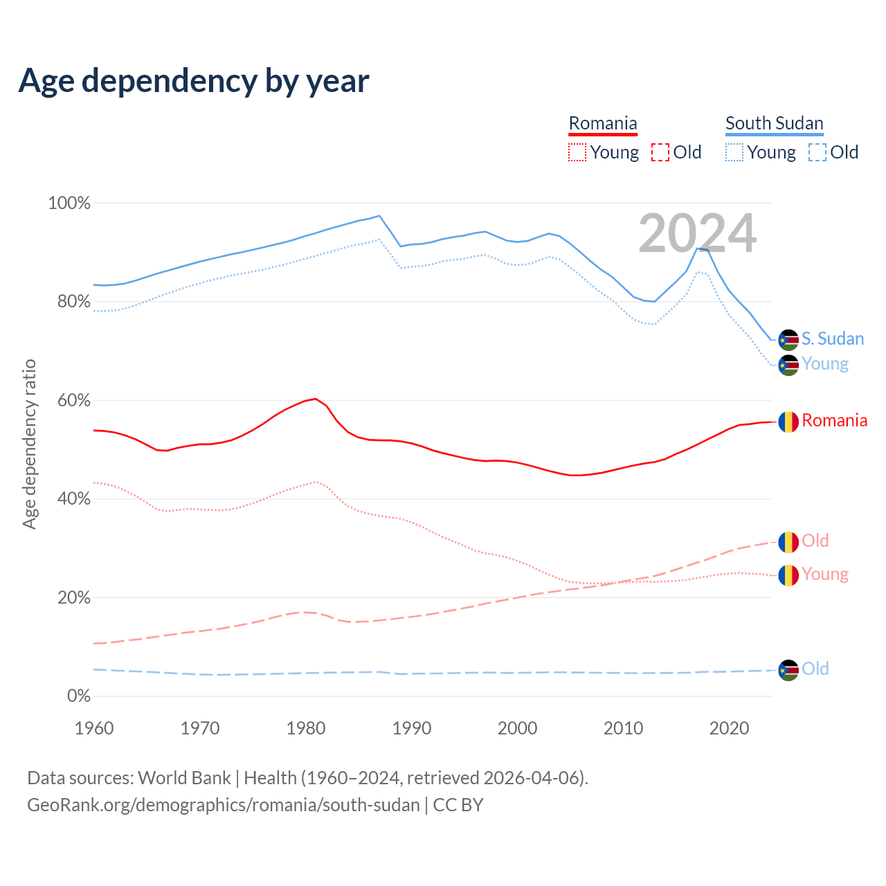 - Romania is ranked 23/196 by median age (oldest to youngest) vs 173/196 for South Sudan.