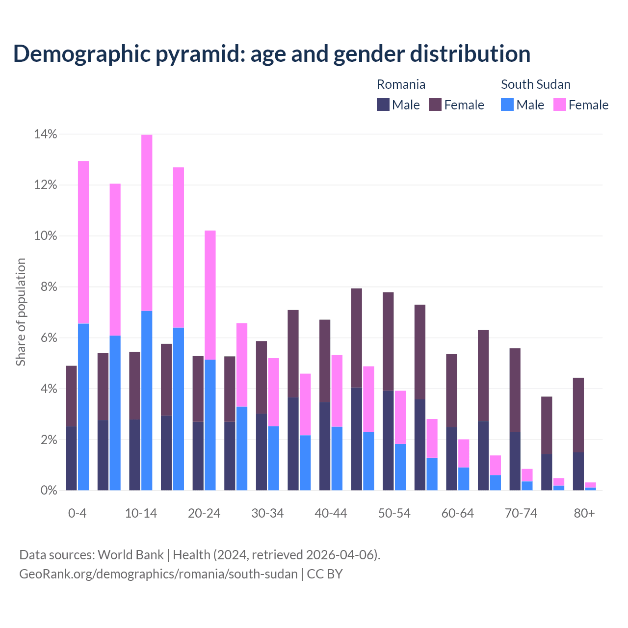 The share of older people aged 65 and over is 20% in Romania and 2.99% in South Sudan. Life expectancy in Romania compared to South Sudan .