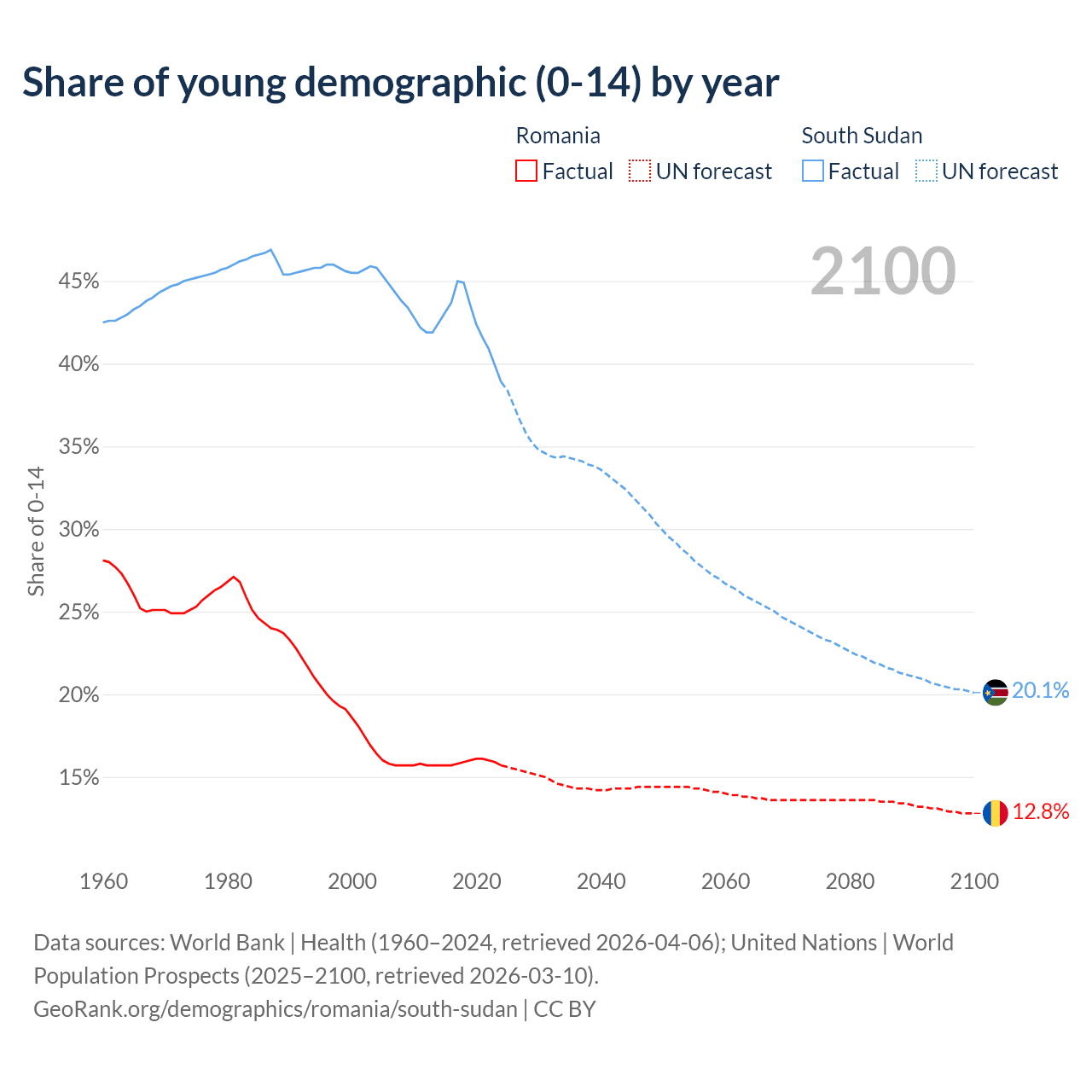 - The share of young demographic (0-15 years old) in Romania is 15.7% vs 38.9% in South Sudan.