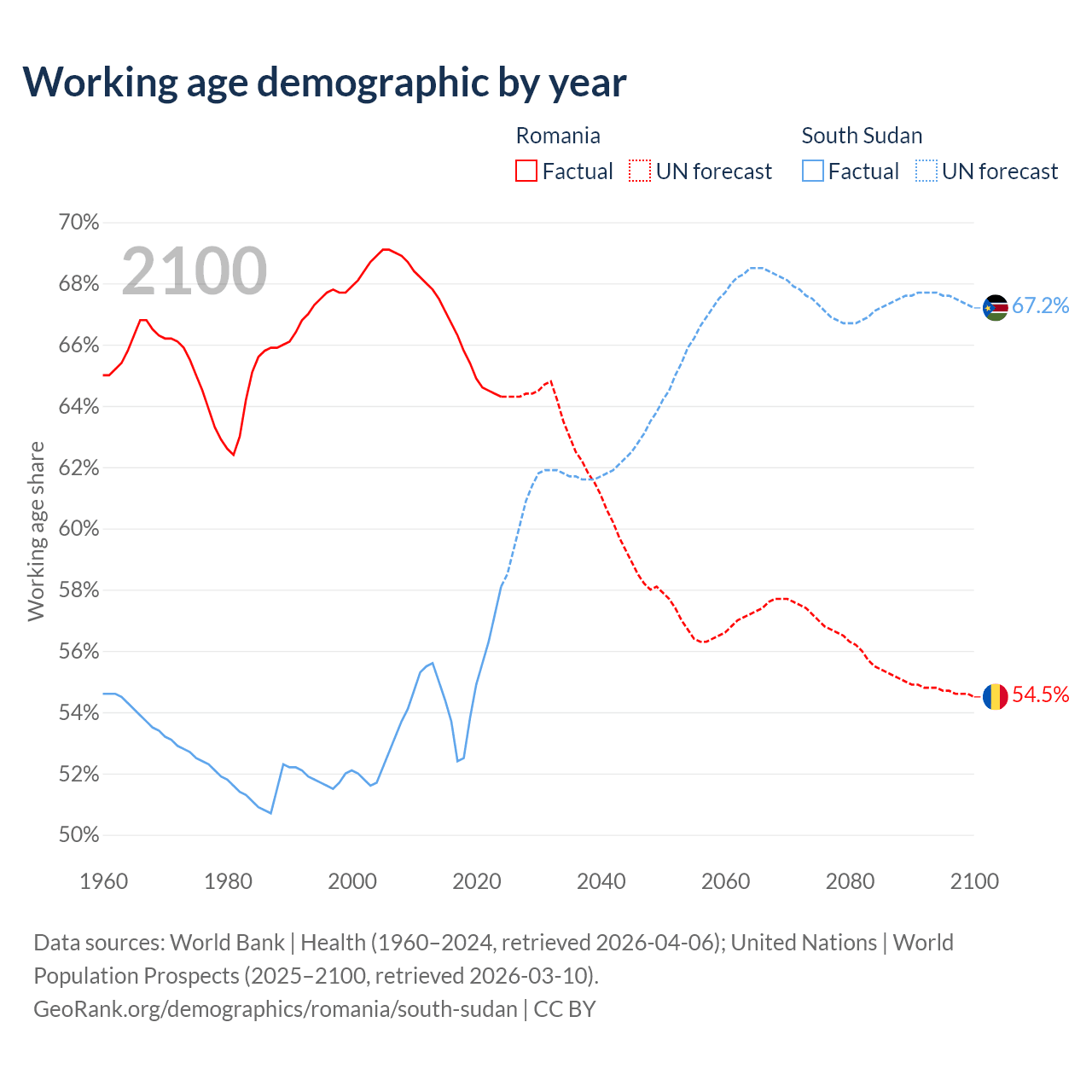 - Romania has 12.1M working age adults (aged 15-64) vs 7.27M in South Sudan.