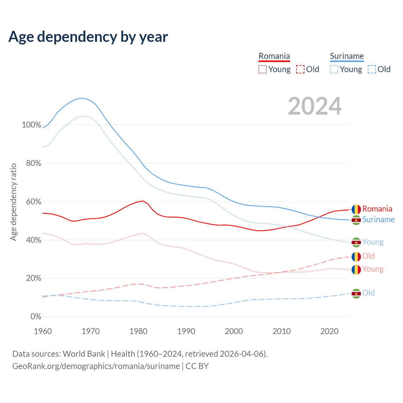 - The share of young demographic (0-15 years old) in Romania is 15.7% vs 25.6% in Suriname.