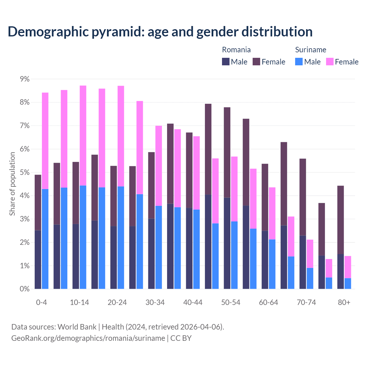 - The share of old-age demographic (65+) in Romania is 20% vs 7.9% in Suriname.