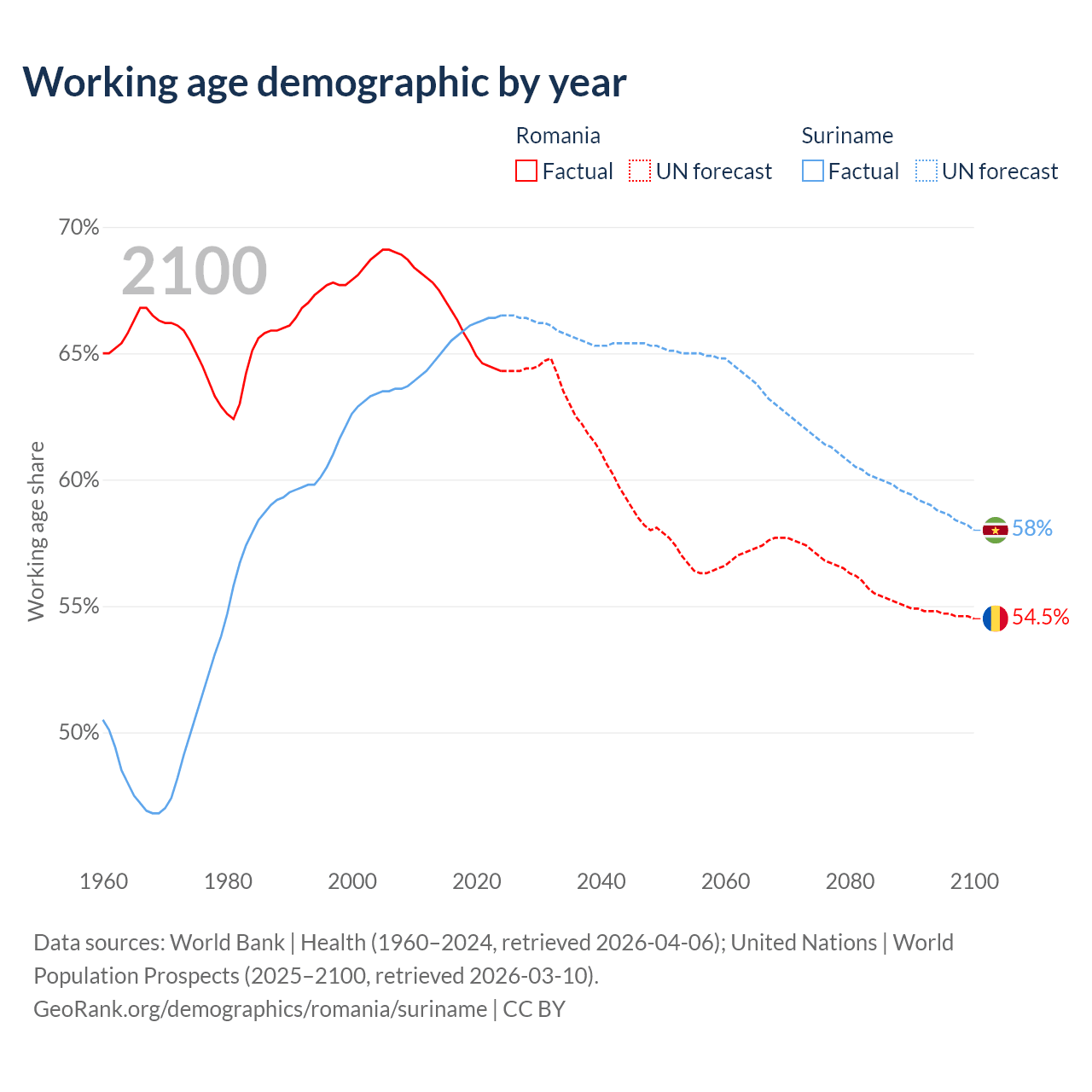 Median age Romania vs Suriname, 1960-2100