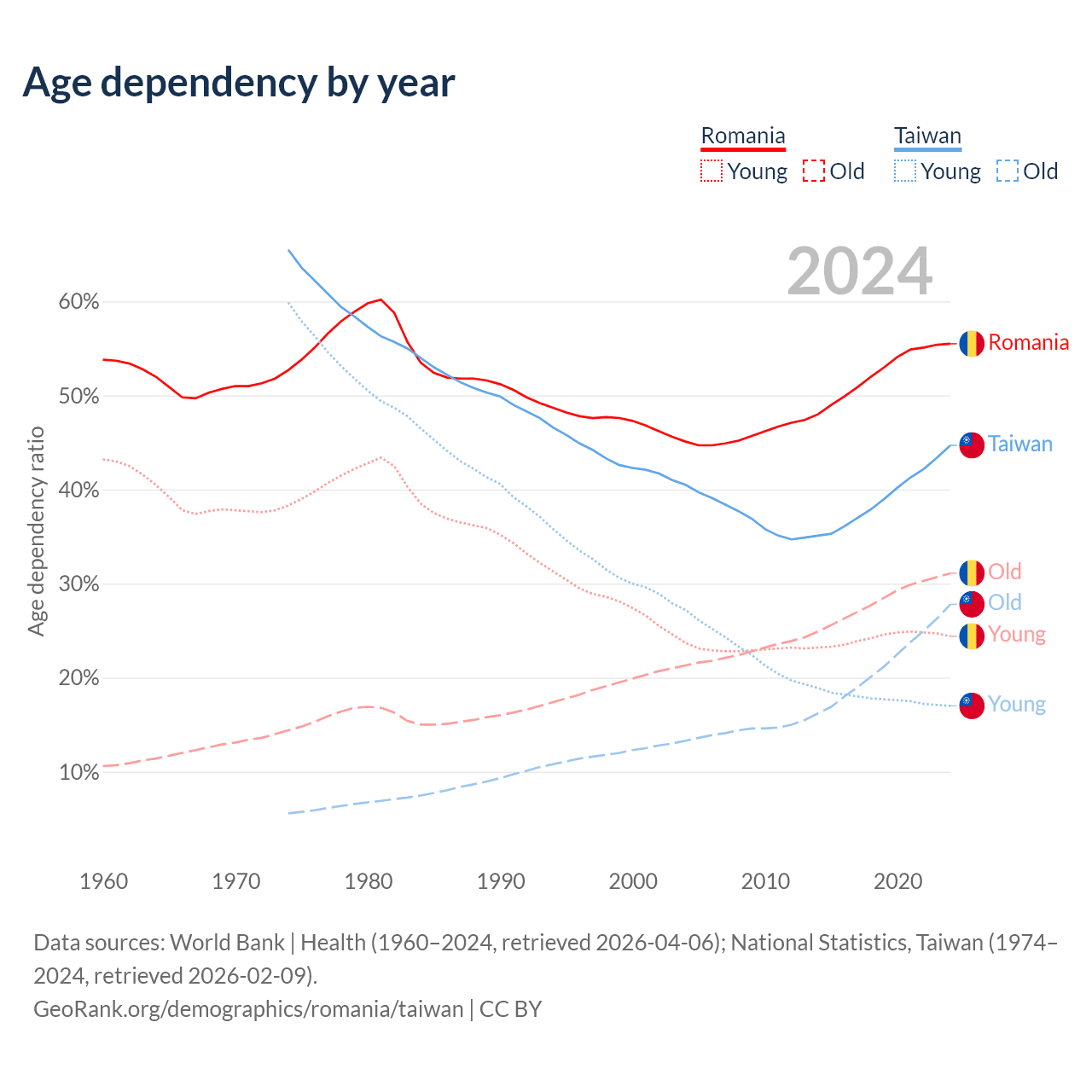 Data sources: World Bank | Health (1960–2024, retrieved 2026-04-06); U.S. Census Bureau (1960–2024, retrieved 2026-02-08); National Statistics, Taiwan (1974–2024, retrieved 2026-02-09).