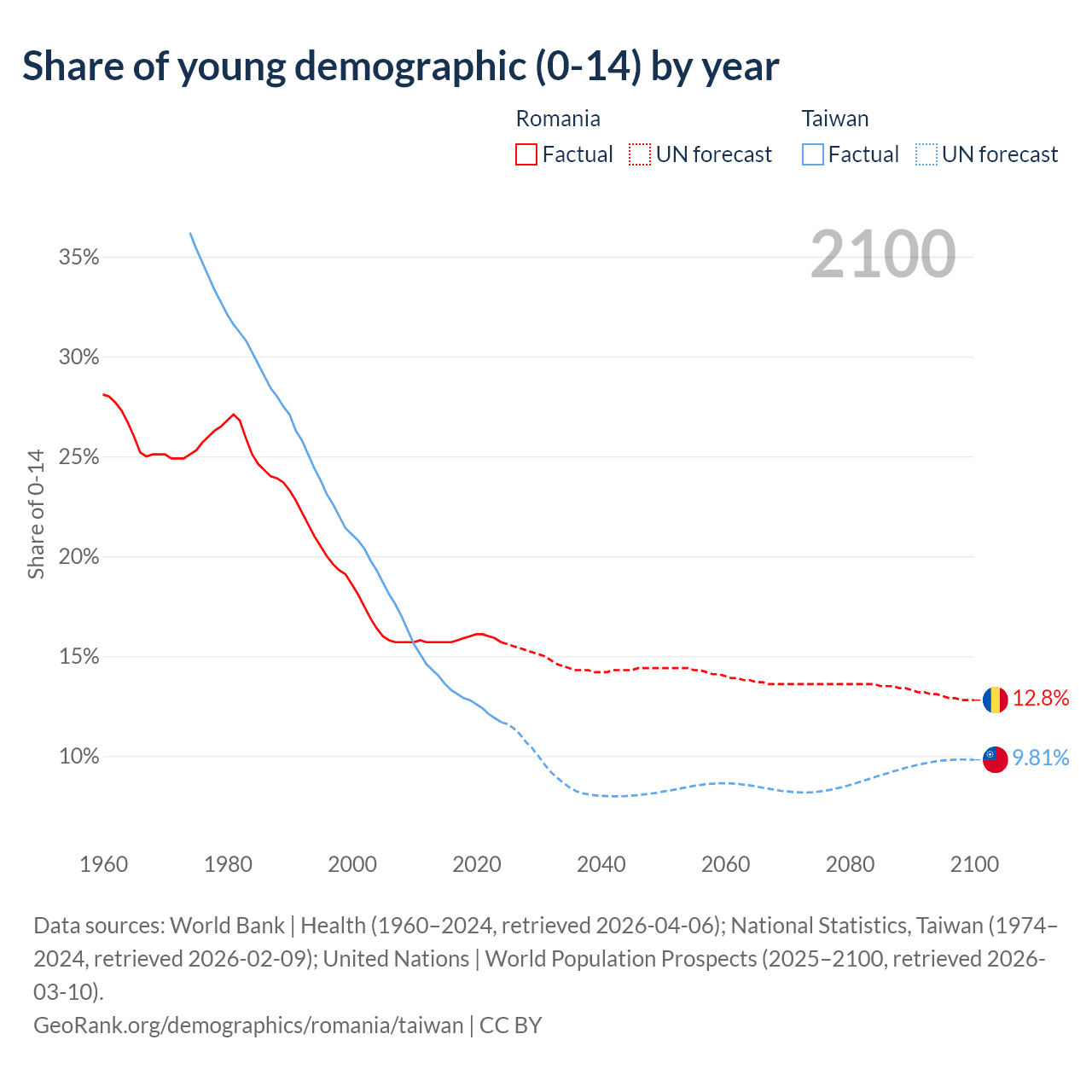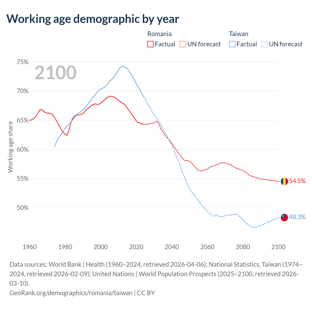 Median age Romania vs Taiwan, 1960-2100