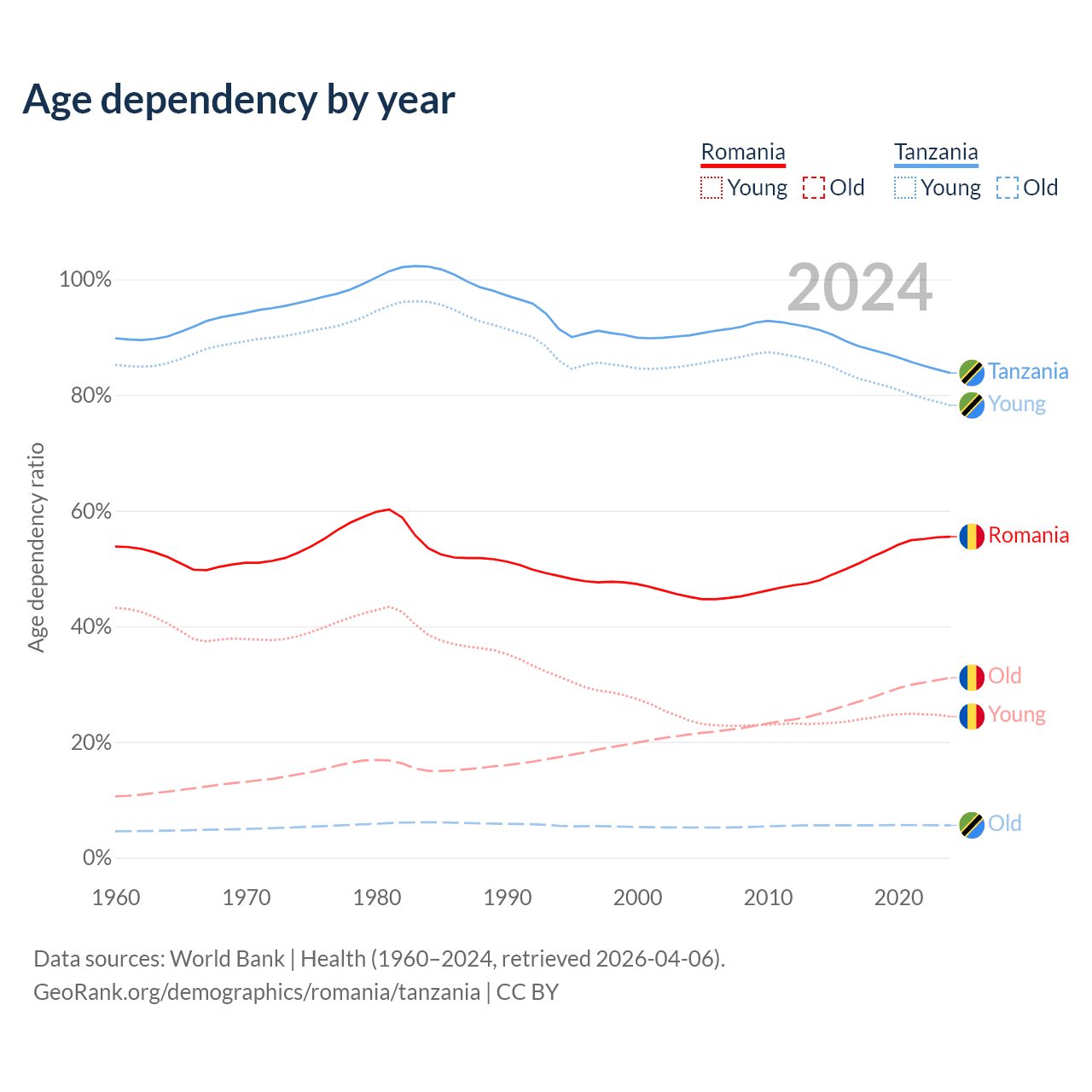 - Romania is ranked 23/196 by median age (oldest to youngest) vs 184/196 for Tanzania.