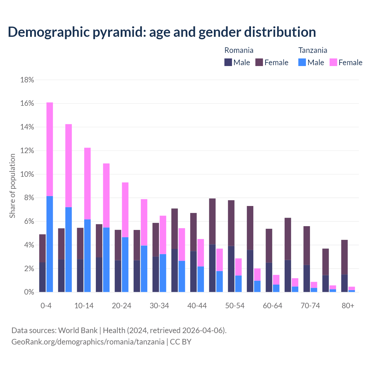 - As of 2026, the population of Romania is 18.8M vs 73.1M in Tanzania - 3.88 times difference.