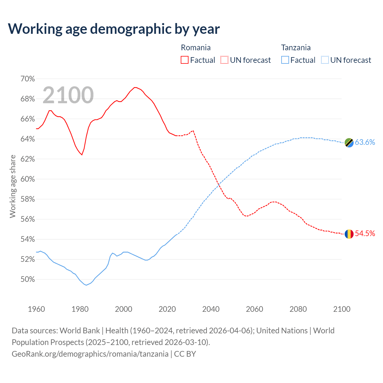 - Romania has 12.1M working age adults (aged 15-64) vs 39.8M in Tanzania.