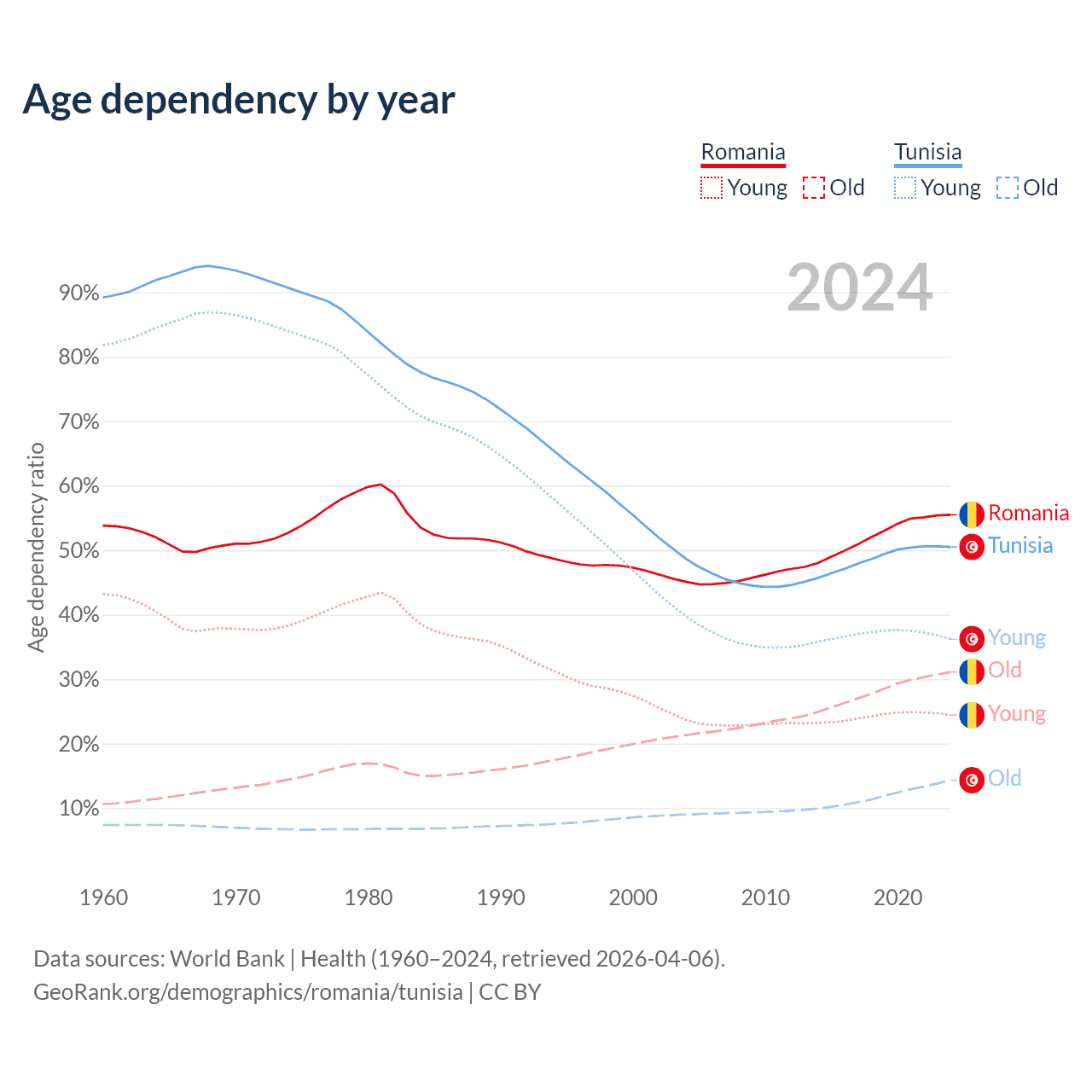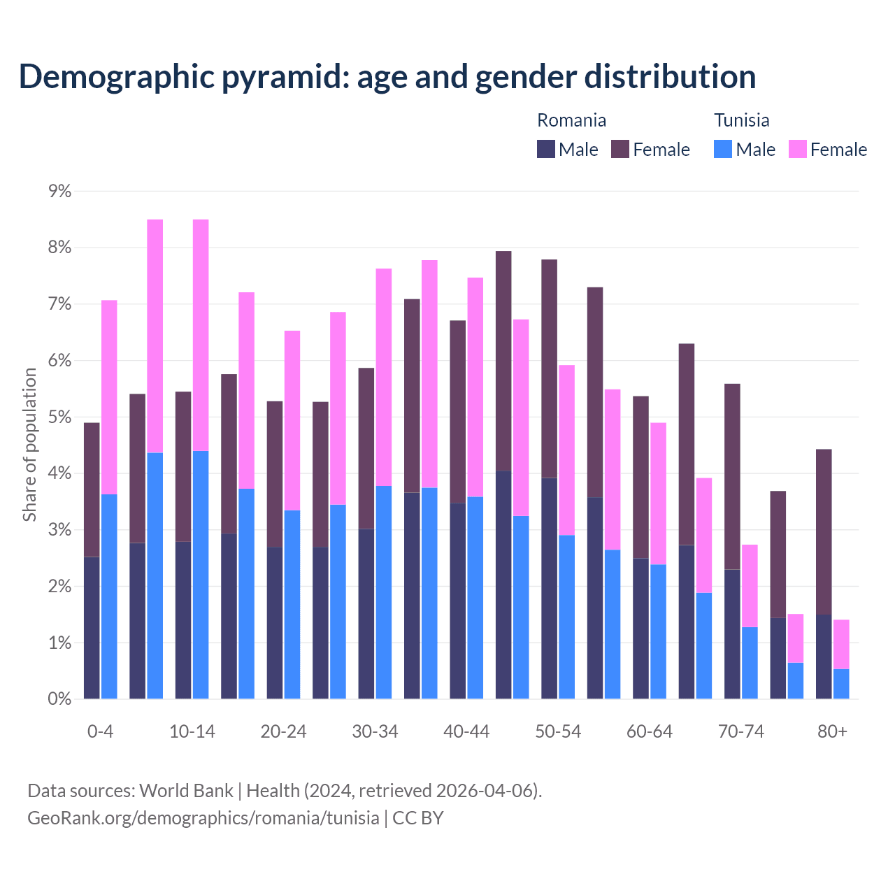 - Romania is ranked 23/196 by median age (oldest to youngest) vs 86/196 for Tunisia.