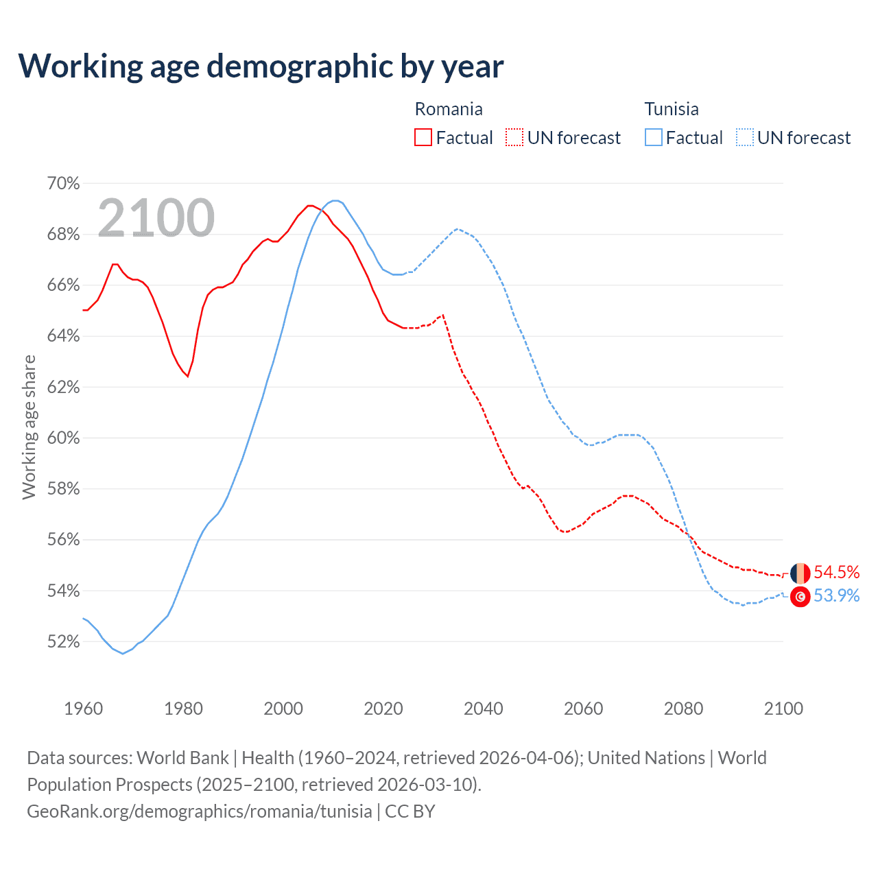 - Romania has 12.1M working age adults (aged 15-64) vs 8.26M in Tunisia.