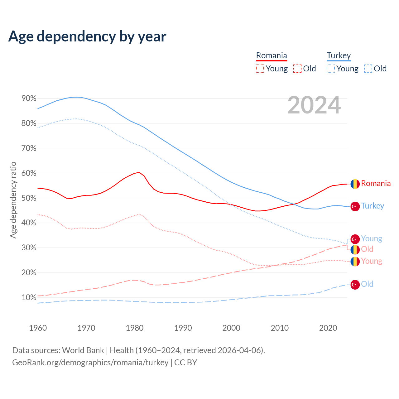 - Romania is ranked 23/196 by median age (oldest to youngest) vs 83/196 for Turkey.