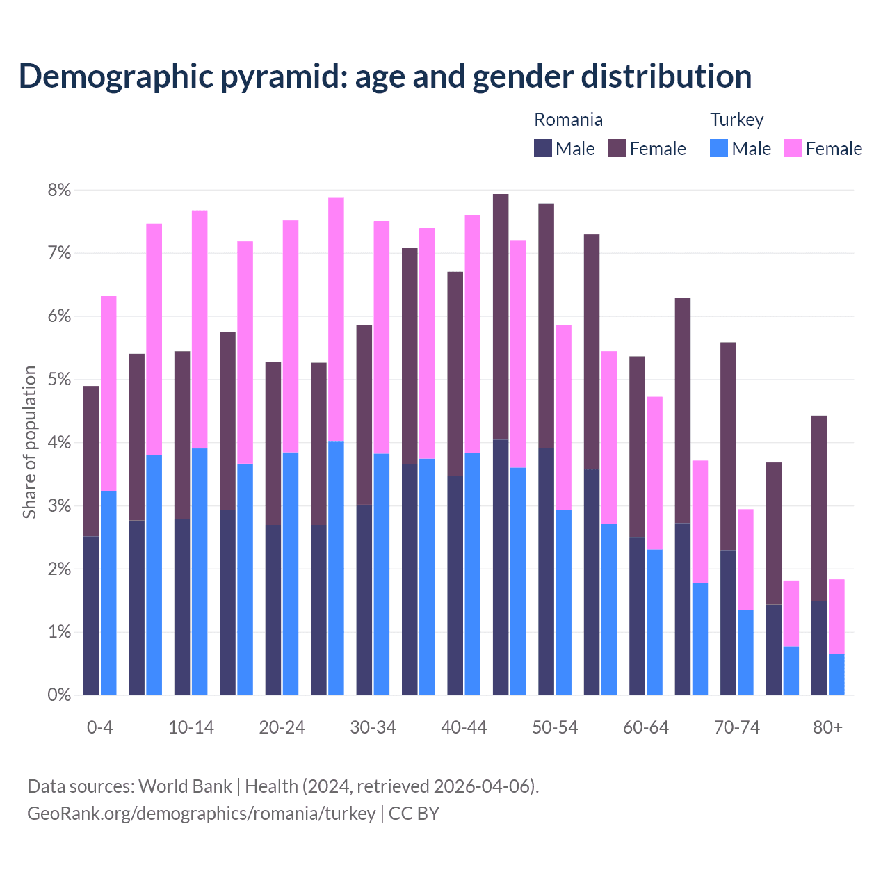The share of older people aged 65 and over is 20% in Romania and 10.3% in Turkey. Life expectancy in Romania compared to Turkey .