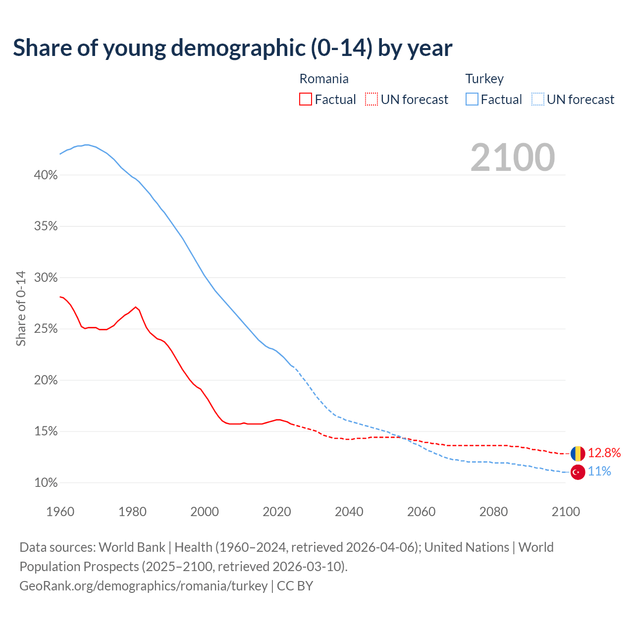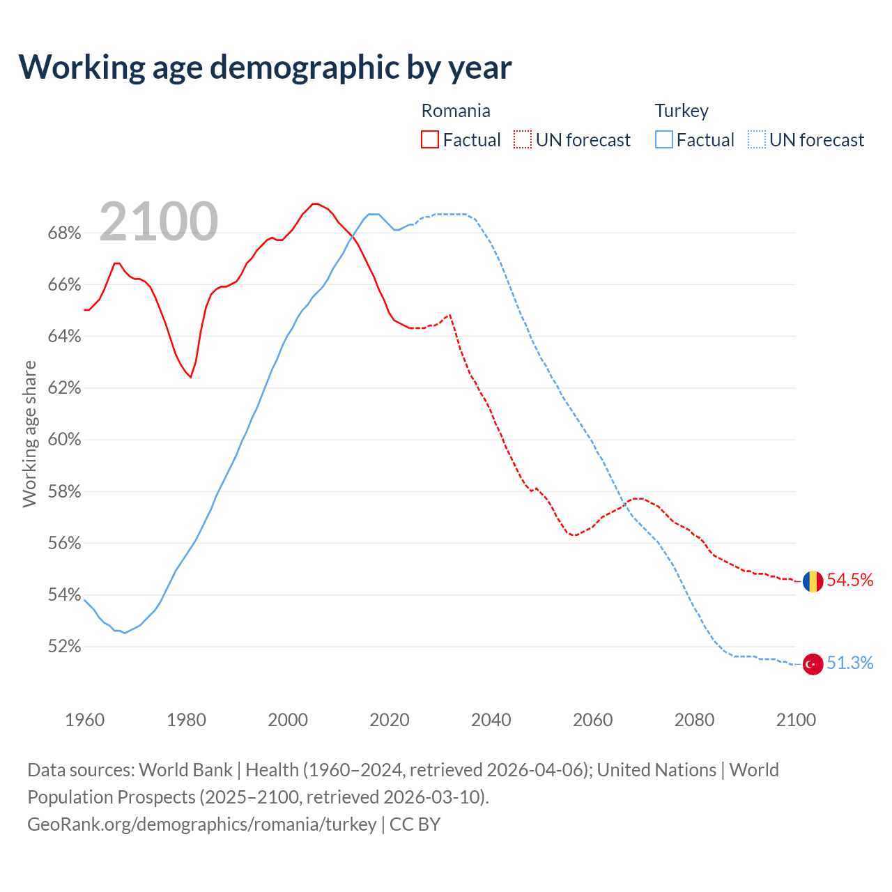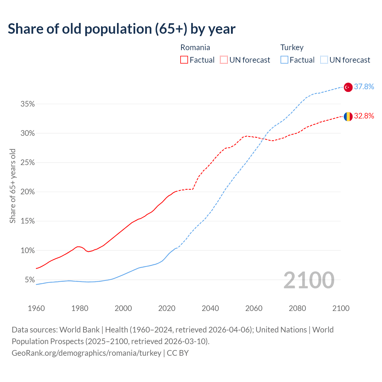 Median age Romania vs Turkey, 1960-2100