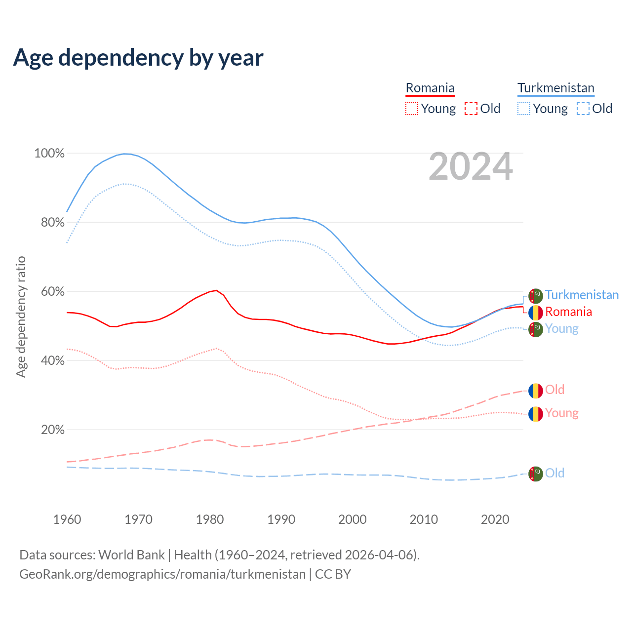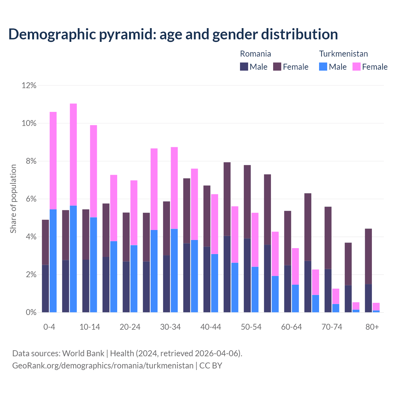 The share of older people aged 65 and over is 20% in Romania and 4.53% in Turkmenistan. Life expectancy in Romania compared to Turkmenistan .