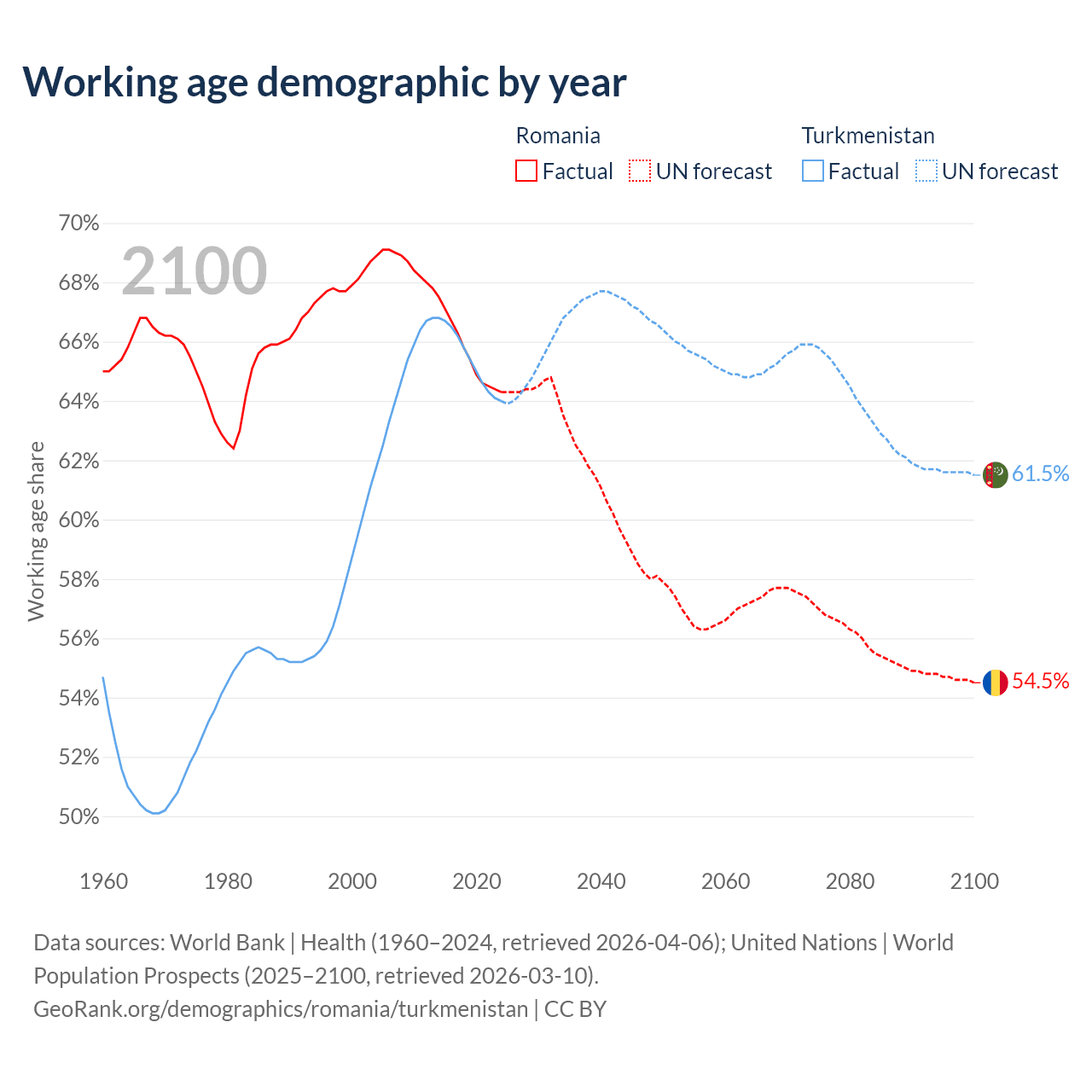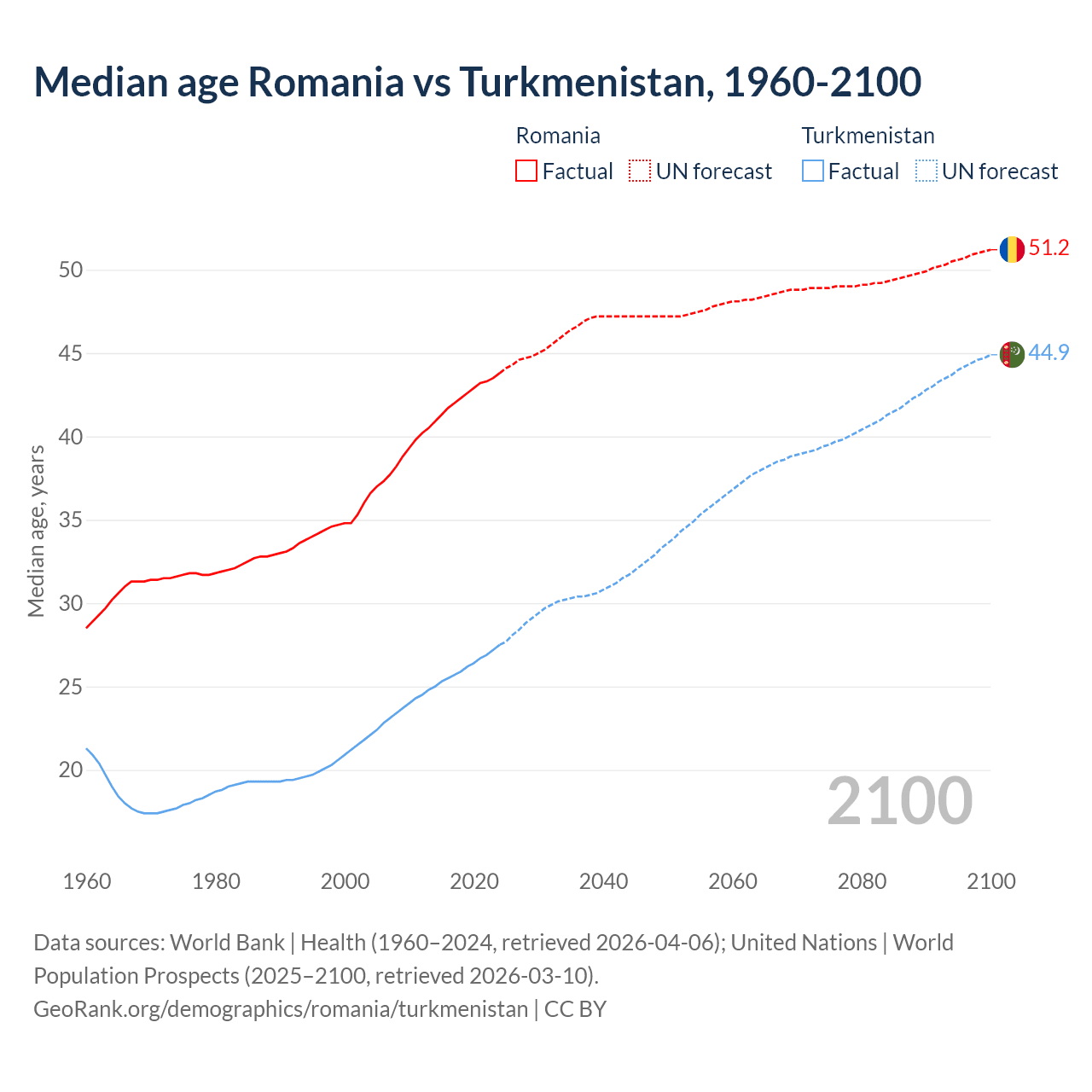 Median age Romania vs Turkmenistan, 1960-2100