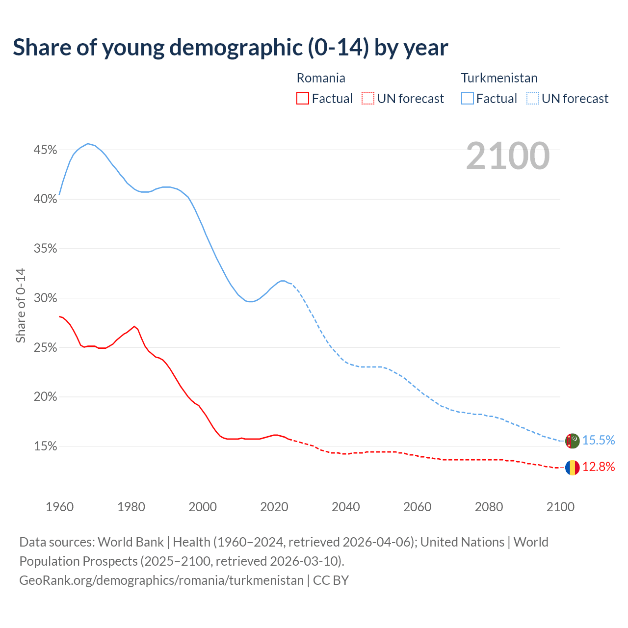- The share of young demographic (0-15 years old) in Romania is 15.7% vs 31.5% in Turkmenistan.