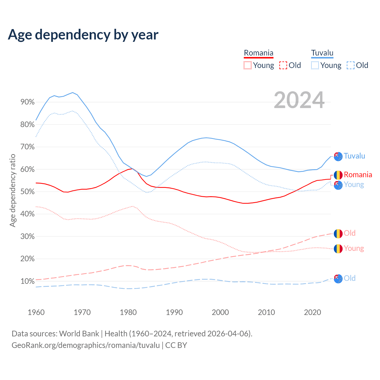 - The share of old-age demographic (65+) in Romania is 20% vs 6.67% in Tuvalu.