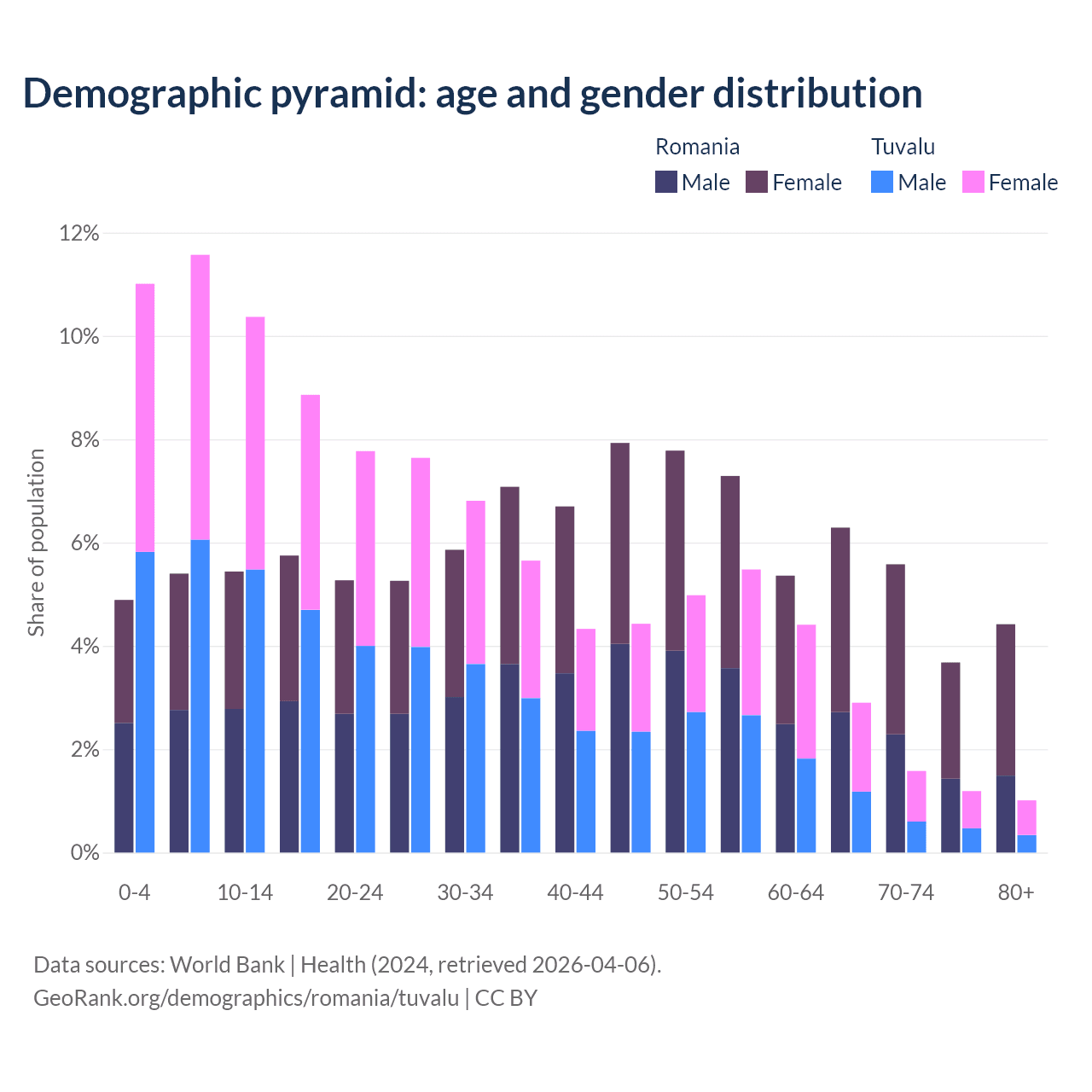 The share of older people aged 65 and over is 20% in Romania and 6.67% in Tuvalu. Life expectancy in Romania compared to Tuvalu .