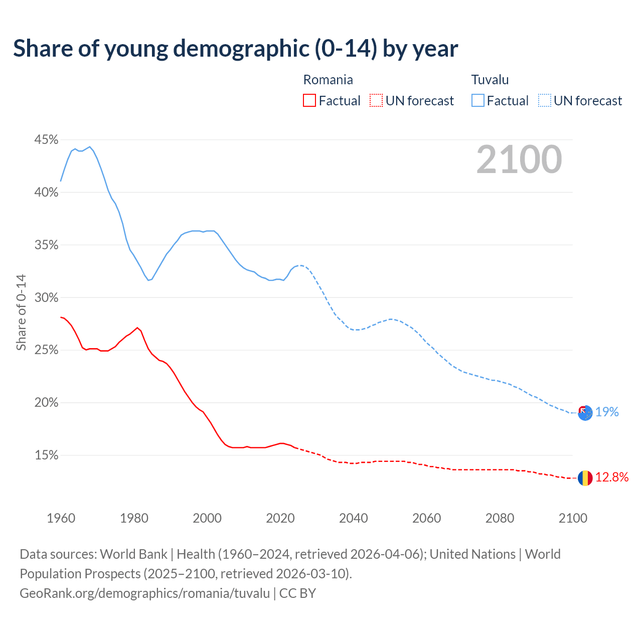 - The share of young demographic (0-15 years old) in Romania is 15.7% vs 32.9% in Tuvalu.
