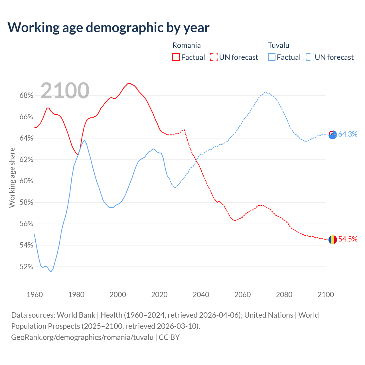 - Romania has 12.1M working age adults (aged 15-64) vs 5.64K in Tuvalu.