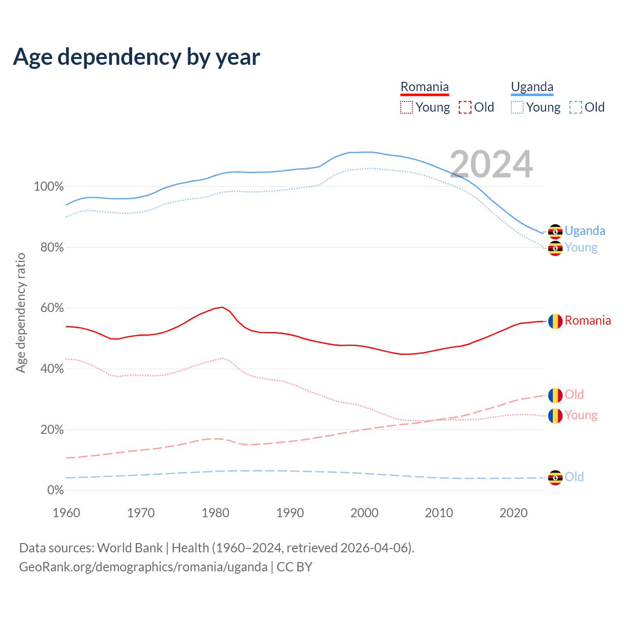 - The share of old-age demographic (65+) in Romania is 20% vs 2.19% in Uganda.