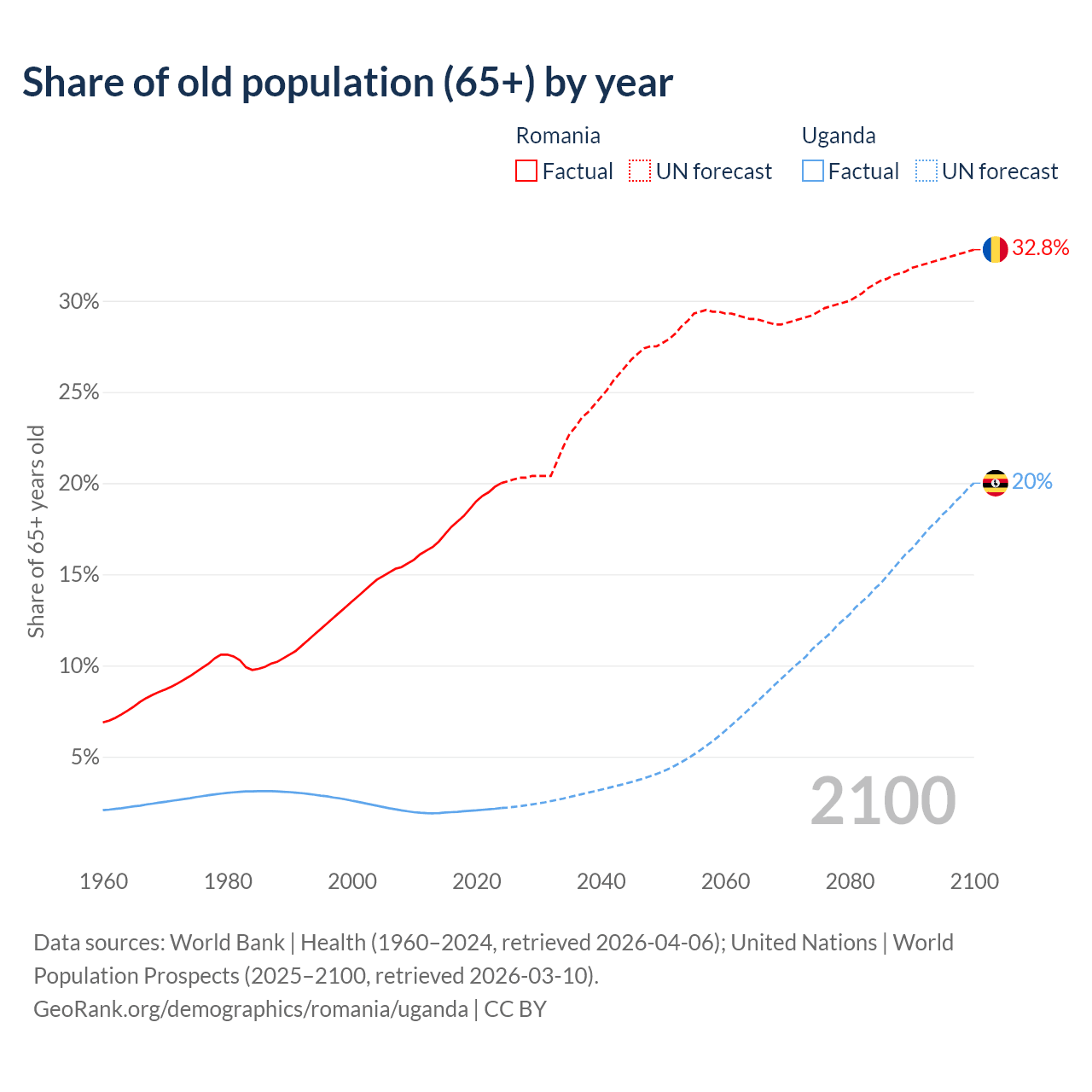 The share of older people aged 65 and over is 20% in Romania and 2.19% in Uganda. Life expectancy in Romania compared to Uganda .
