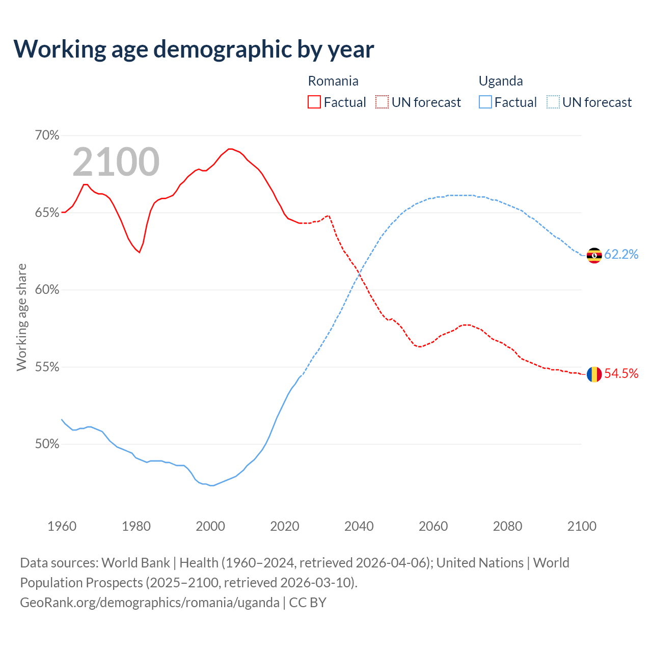 - Romania has 12.1M working age adults (aged 15-64) vs 28.9M in Uganda.
