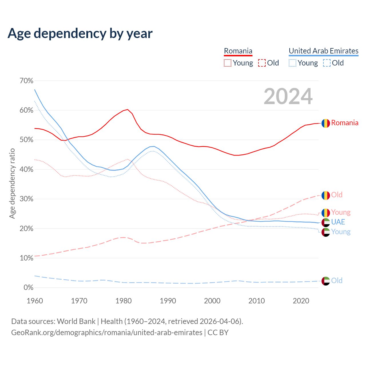 - Romania is ranked 23/196 by median age (oldest to youngest) vs 91/196 for the United Arab Emirates.
