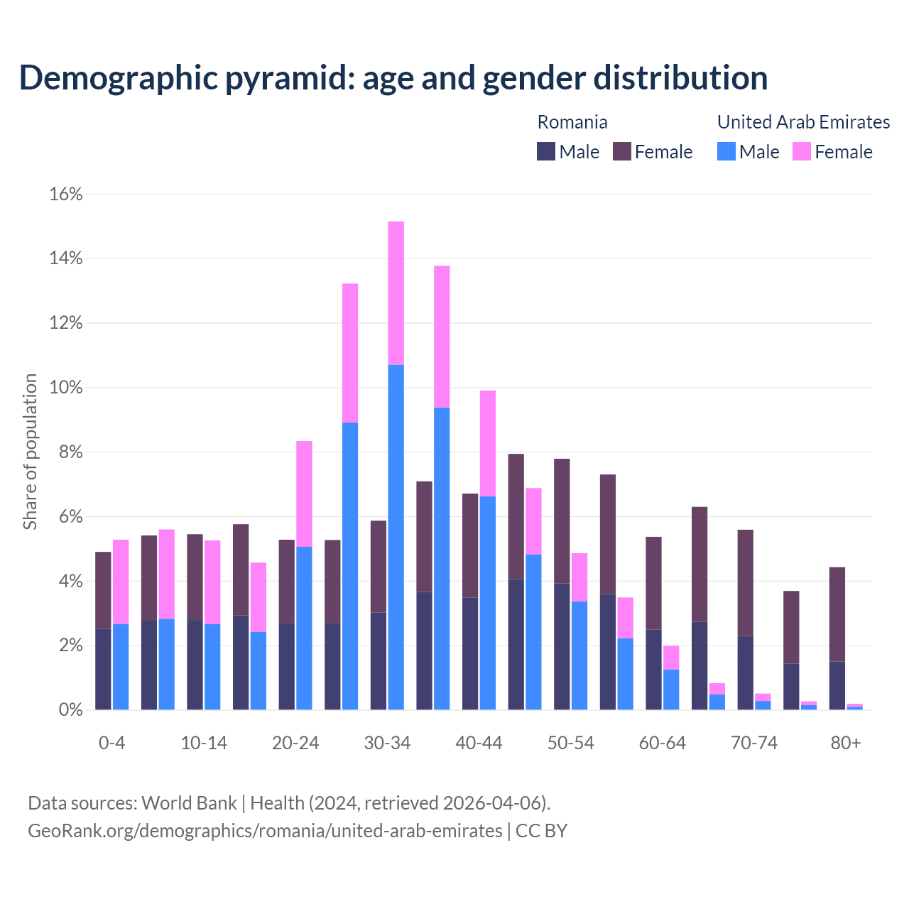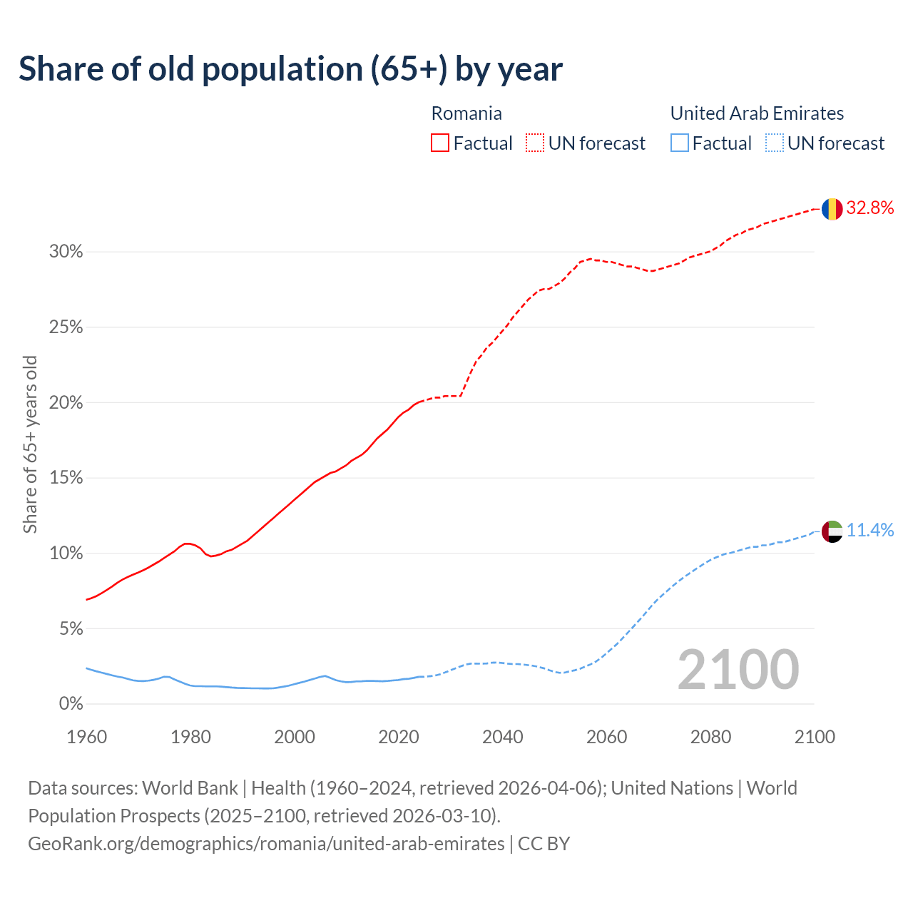 The share of older people aged 65 and over is 20% in Romania and 1.77% in the United Arab Emirates. Life expectancy in Romania compared to the United Arab Emirates .