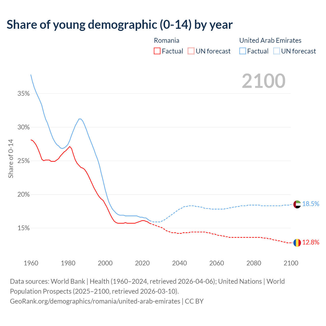 - The share of young demographic (0-15 years old) in Romania is 15.7% vs 16.1% in the United Arab Emirates.