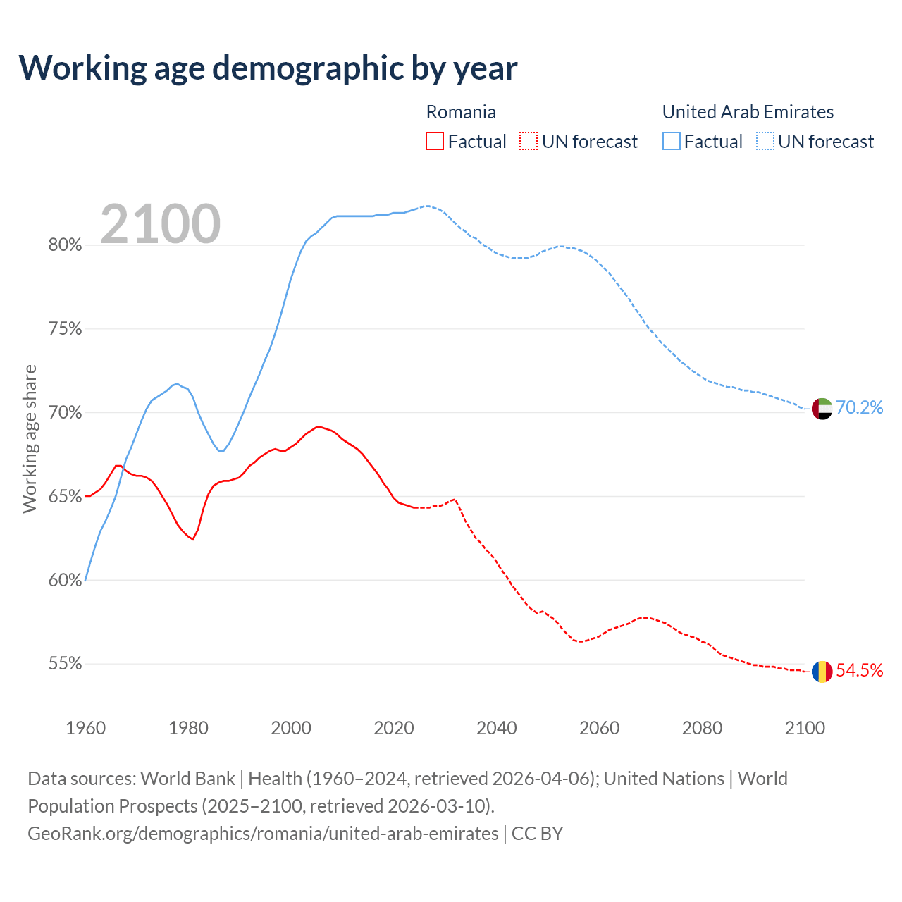 Median age Romania vs United Arab Emirates, 1960-2100