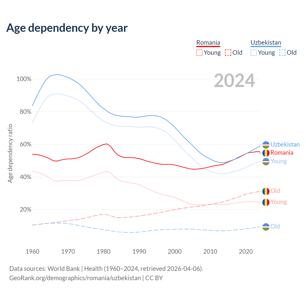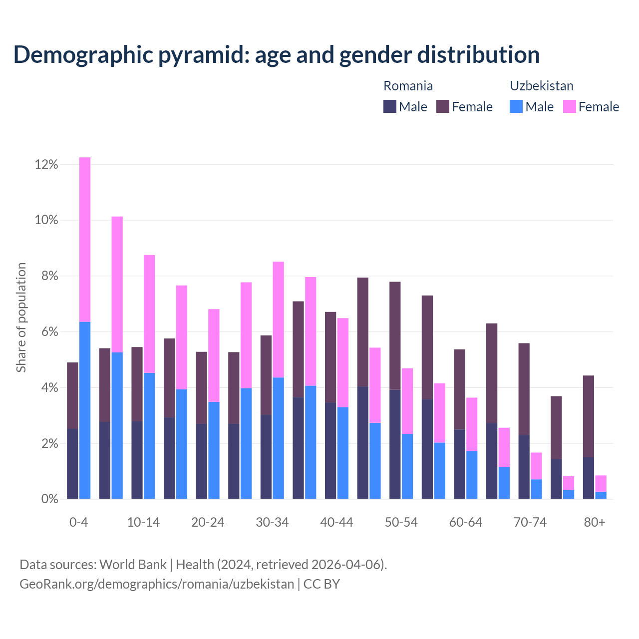The share of older people aged 65 and over is 20% in Romania and 5.86% in Uzbekistan. Life expectancy in Romania compared to Uzbekistan .