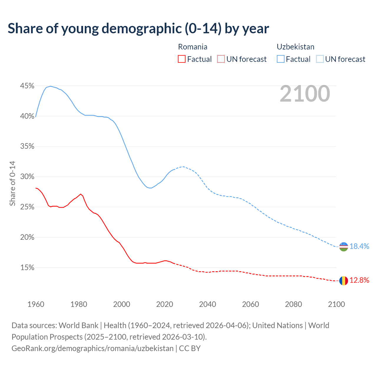 Median age Romania vs Uzbekistan, 1960-2100