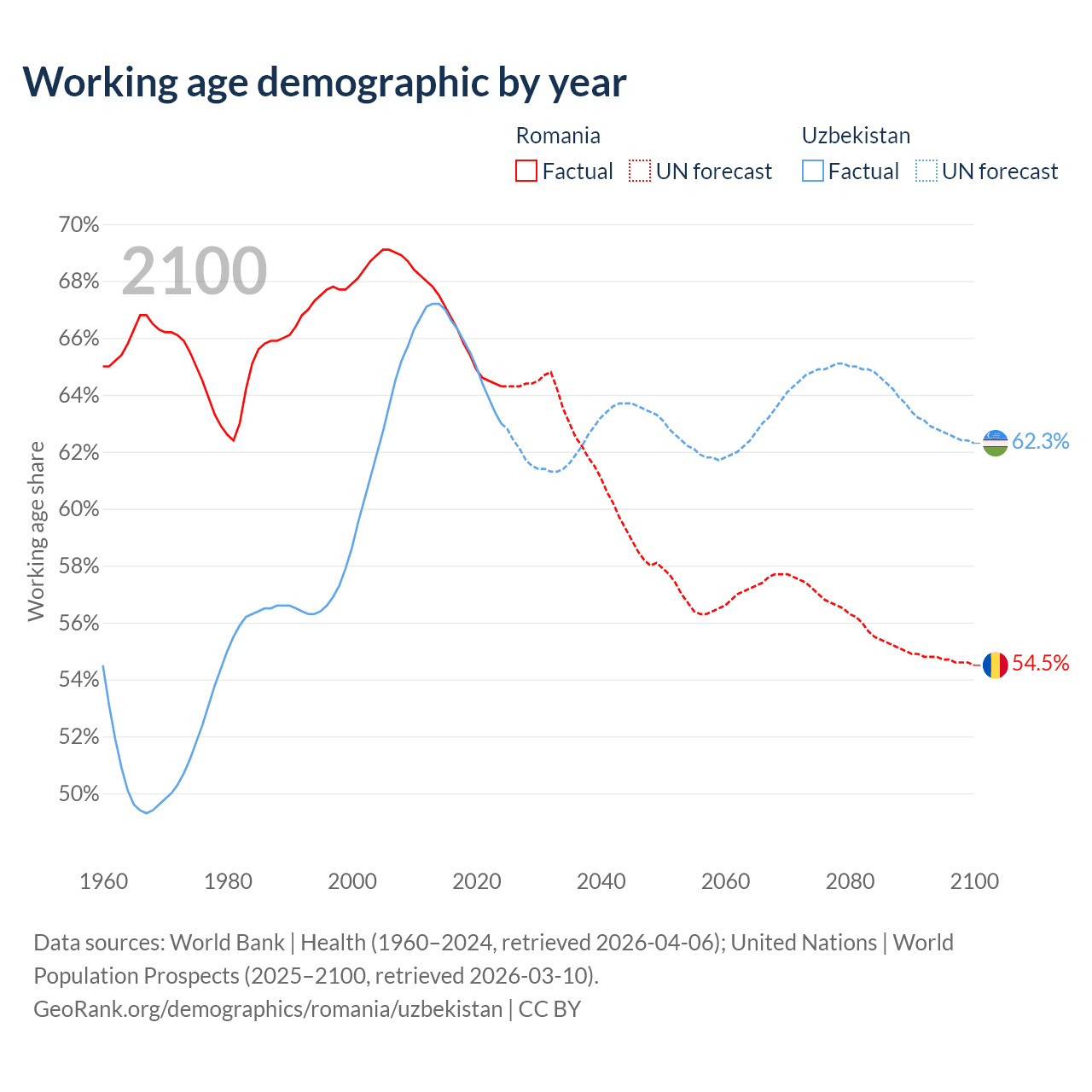 - Romania has 12.1M working age adults (aged 15-64) vs 23.9M in Uzbekistan.
