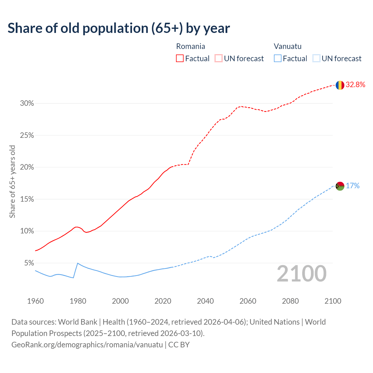 The share of older people aged 65 and over is 20% in Romania and 4.3% in Vanuatu. Life expectancy in Romania compared to Vanuatu .
