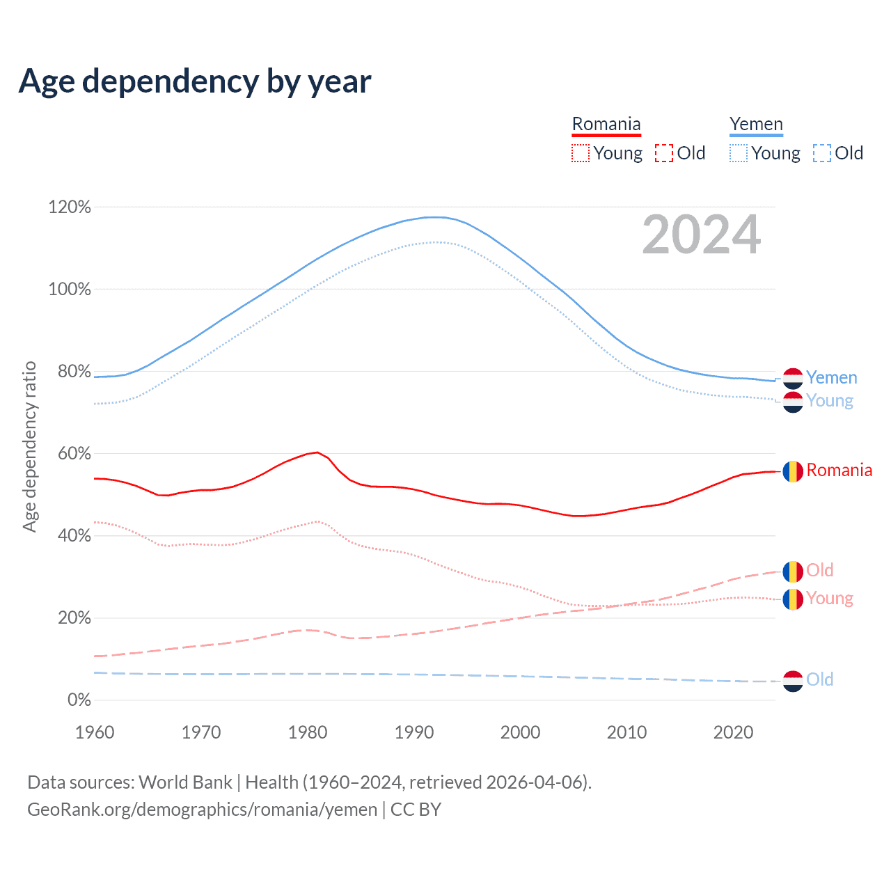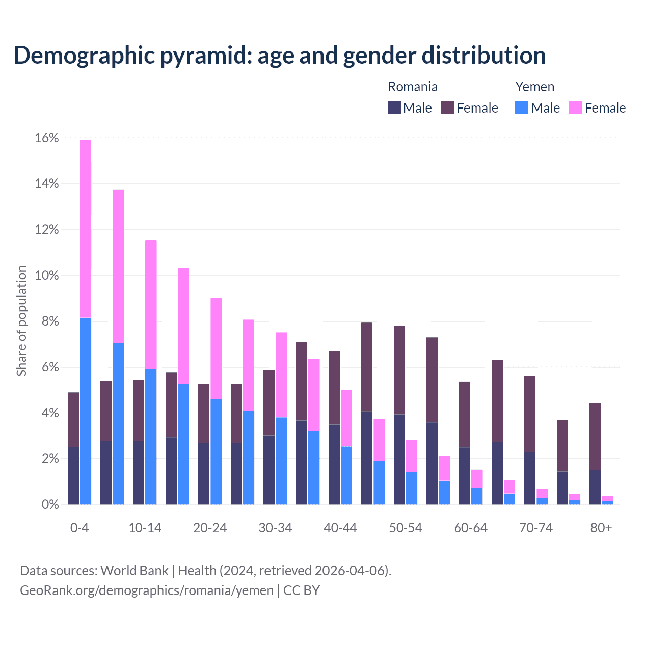 The share of older people aged 65 and over is 20% in Romania and 2.52% in Yemen. Life expectancy in Romania compared to Yemen .