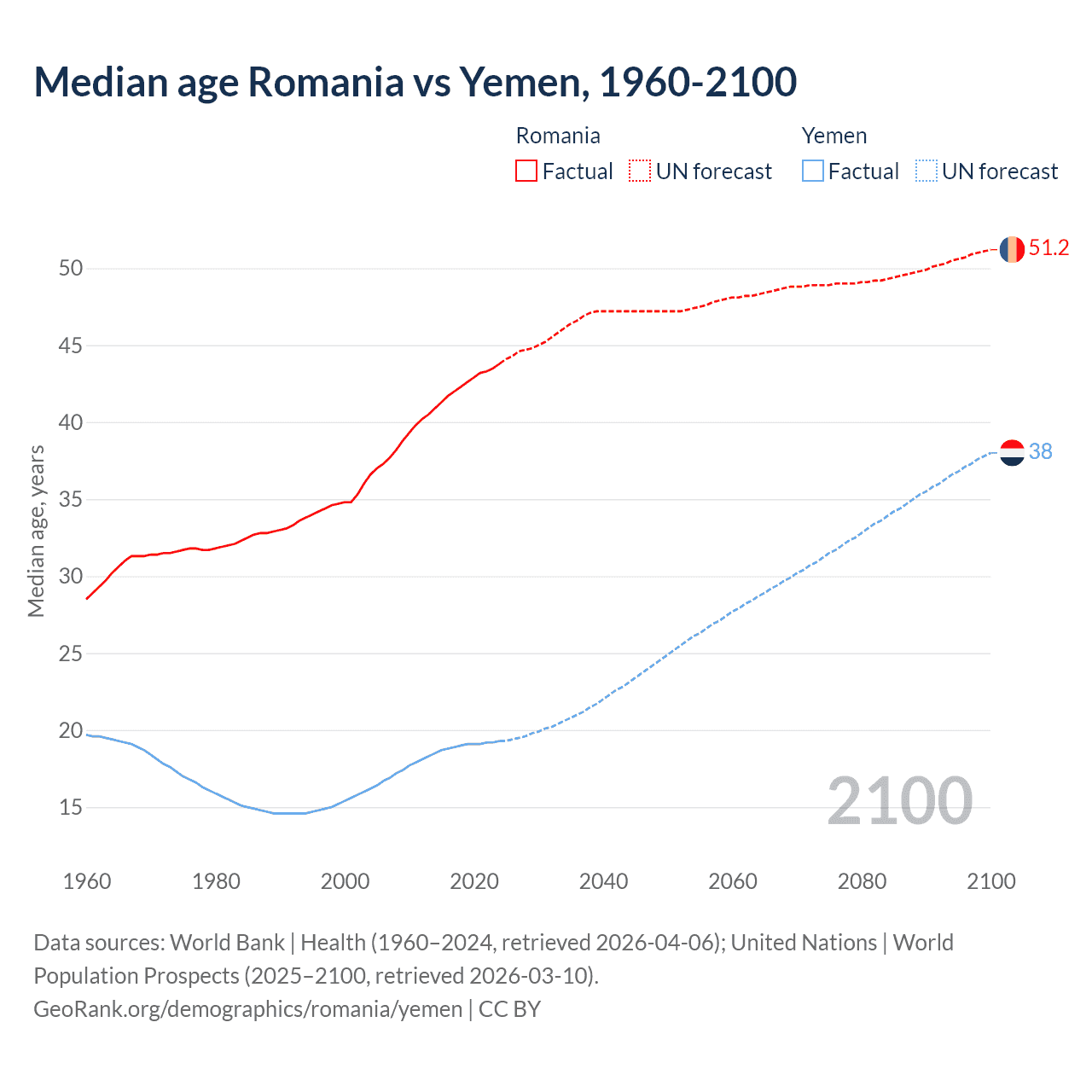 - The median age in Romania is 43.8 years compared to 19.3 years in Yemen.