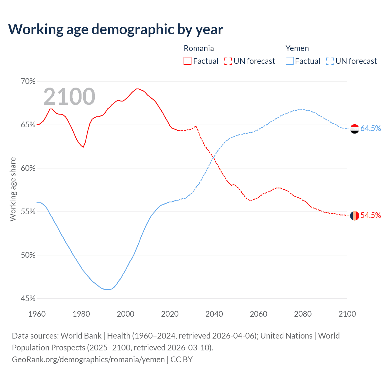 - Romania has 12.1M working age adults (aged 15-64) vs 24.4M in Yemen.