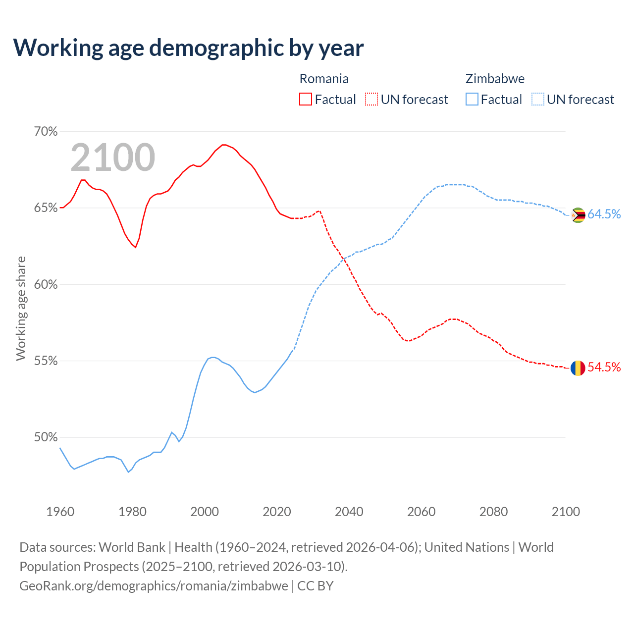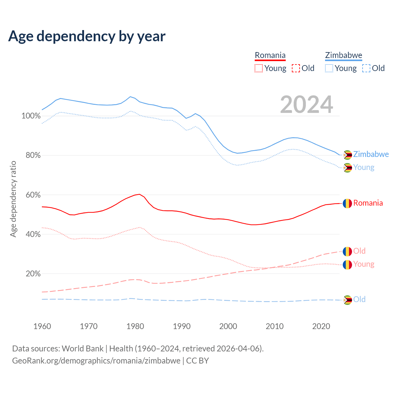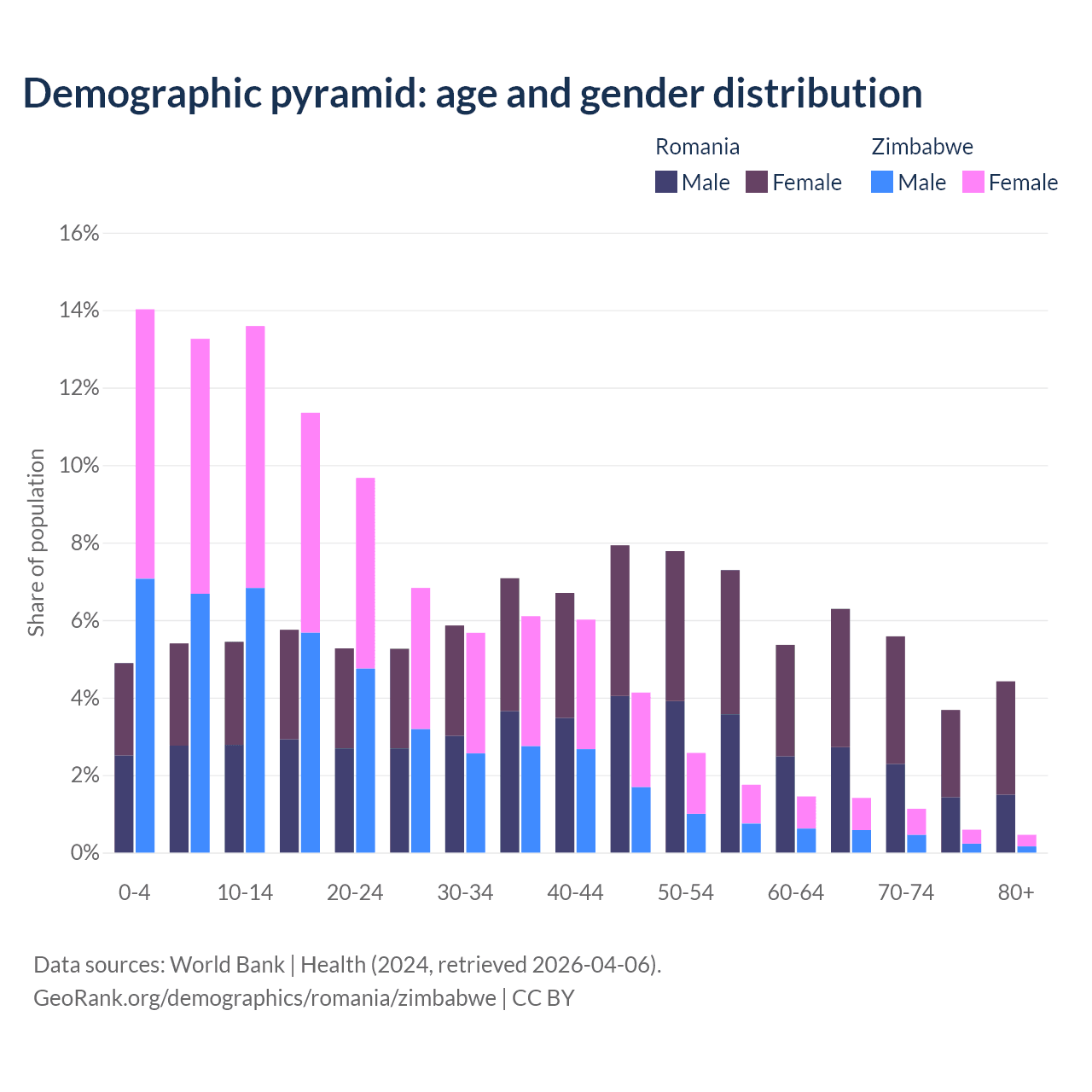 The share of older people aged 65 and over is 20% in Romania and 3.6% in Zimbabwe. Life expectancy in Romania compared to Zimbabwe .
