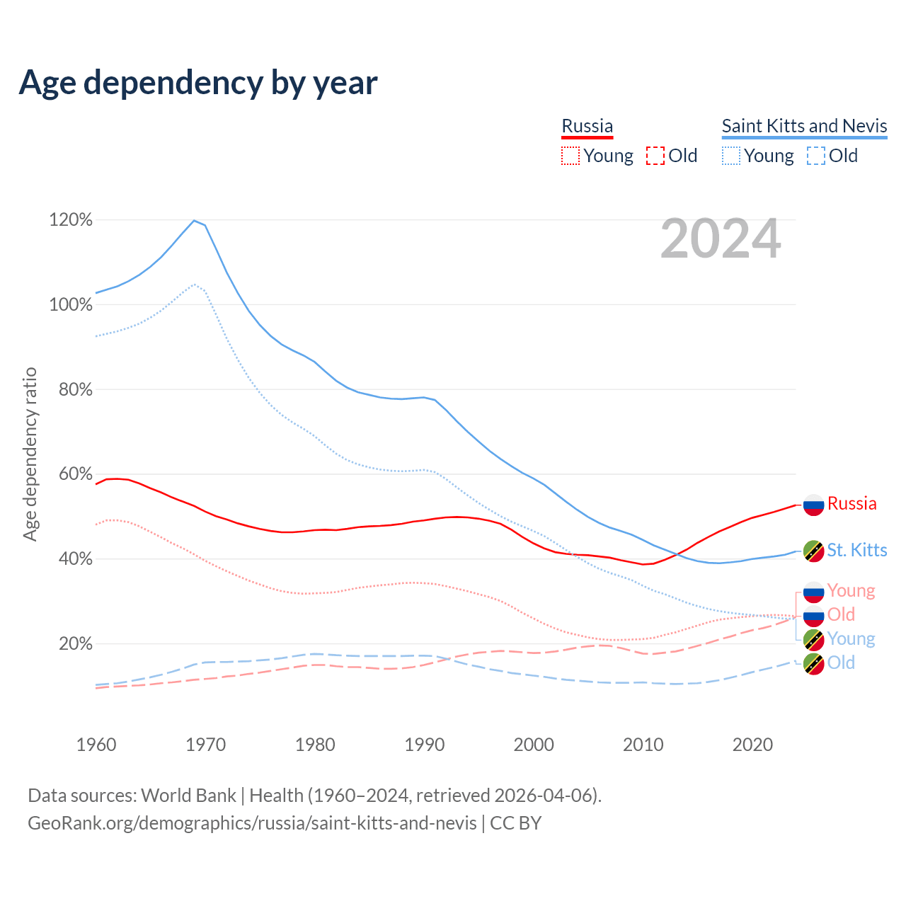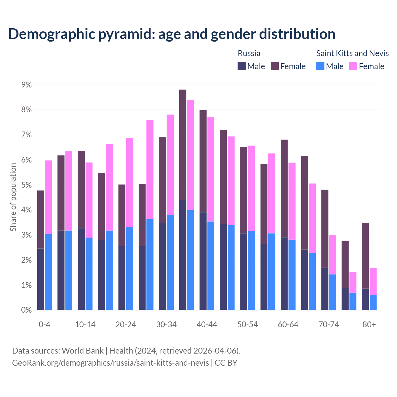 - The share of old-age demographic (65+) in Russia is 17.2% vs 11.2% in Saint Kitts and Nevis.